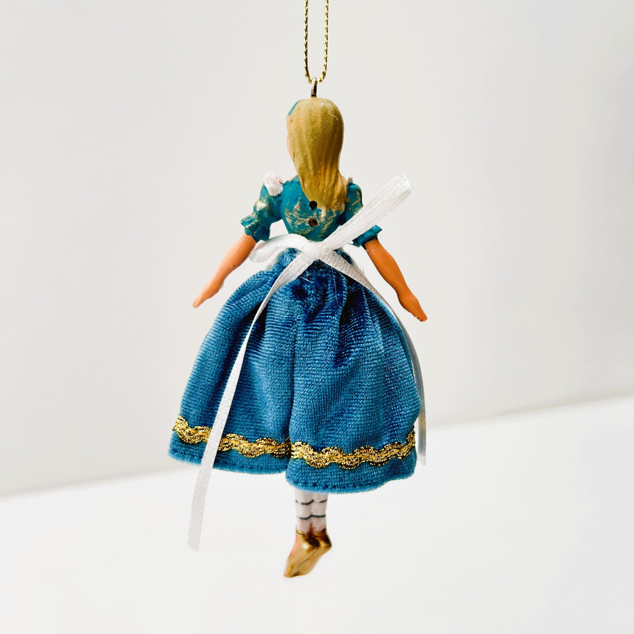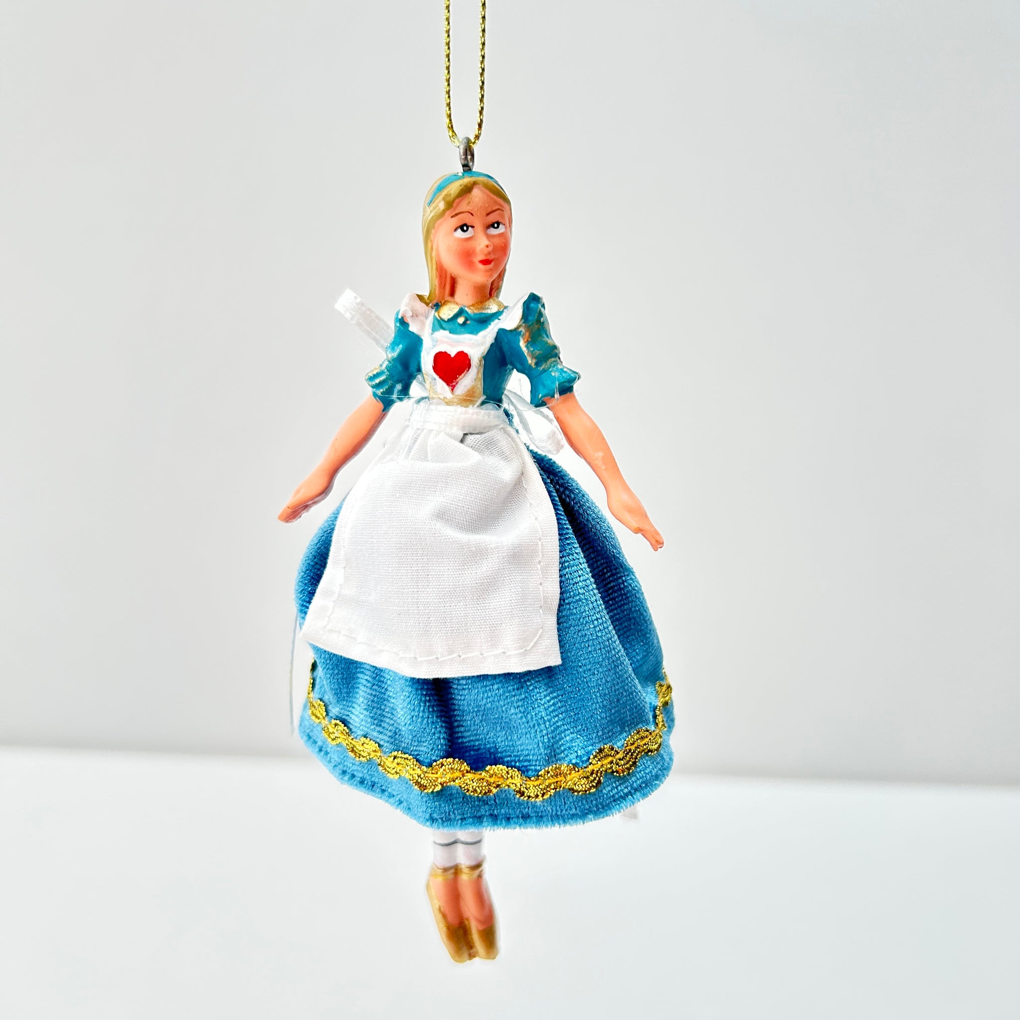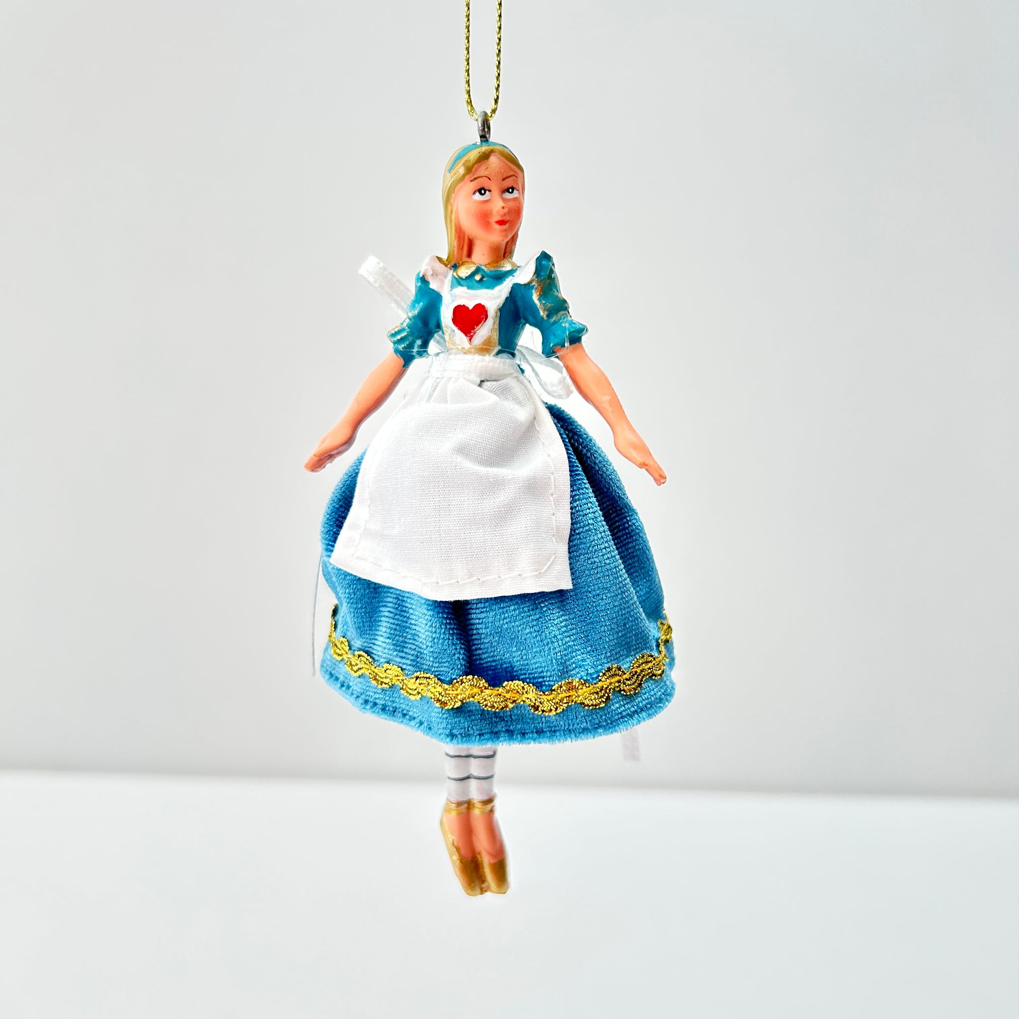 Bring the magic of the classic tale to your tree with this Alice in Wonderland resin decoration. Alice is dressed in her signature blue dress with a white apron, golden trim, and striped stockings, capturing her timeless storybook charm.
