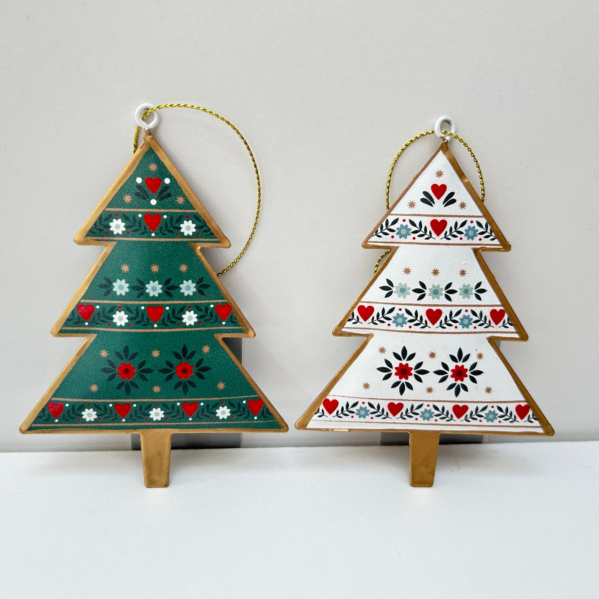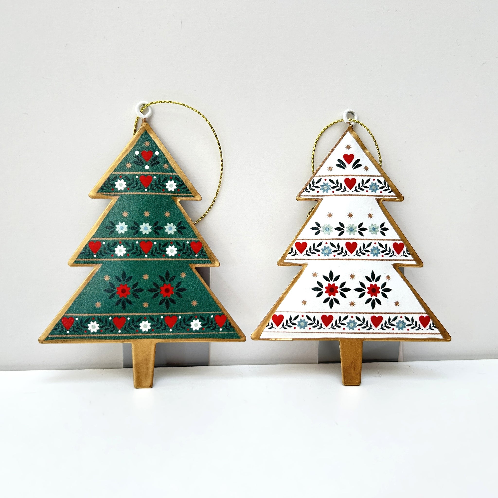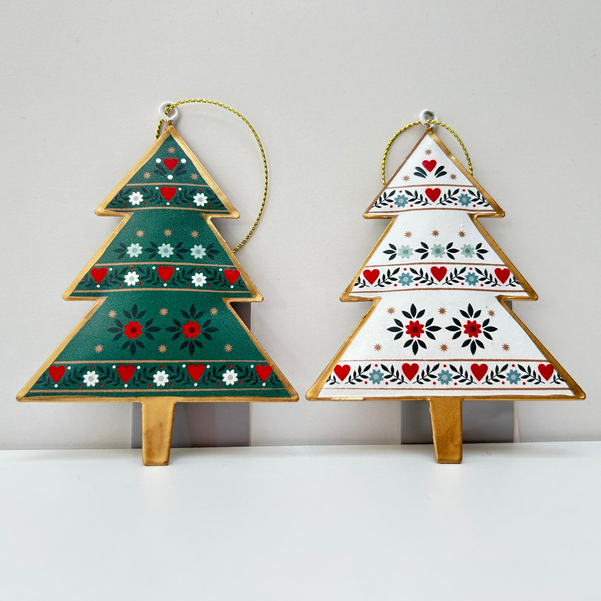 Bring a touch of Alpine charm to your Christmas décor with this delightful set of 2 tin tree decorations. Each piece is beautifully designed in a traditional tree shape, finished with intricate alpine-inspired patterns that combine hearts, florals, and festive colours. The set includes one in classic green and one in crisp white, both highlighted with red and gold accents to capture the warmth of the season.
