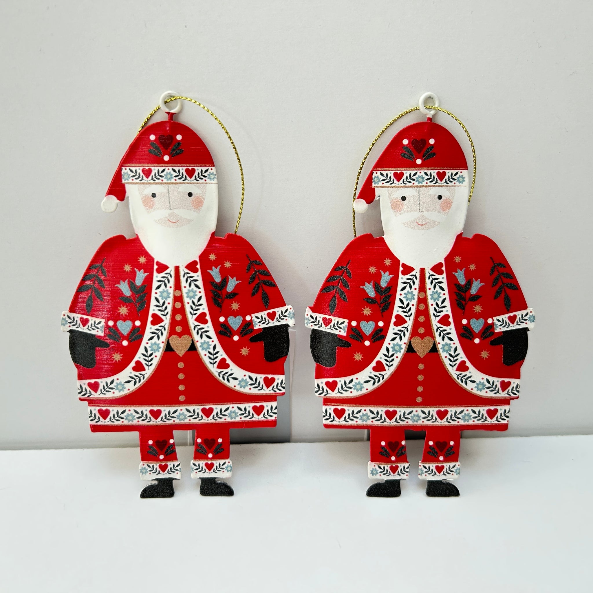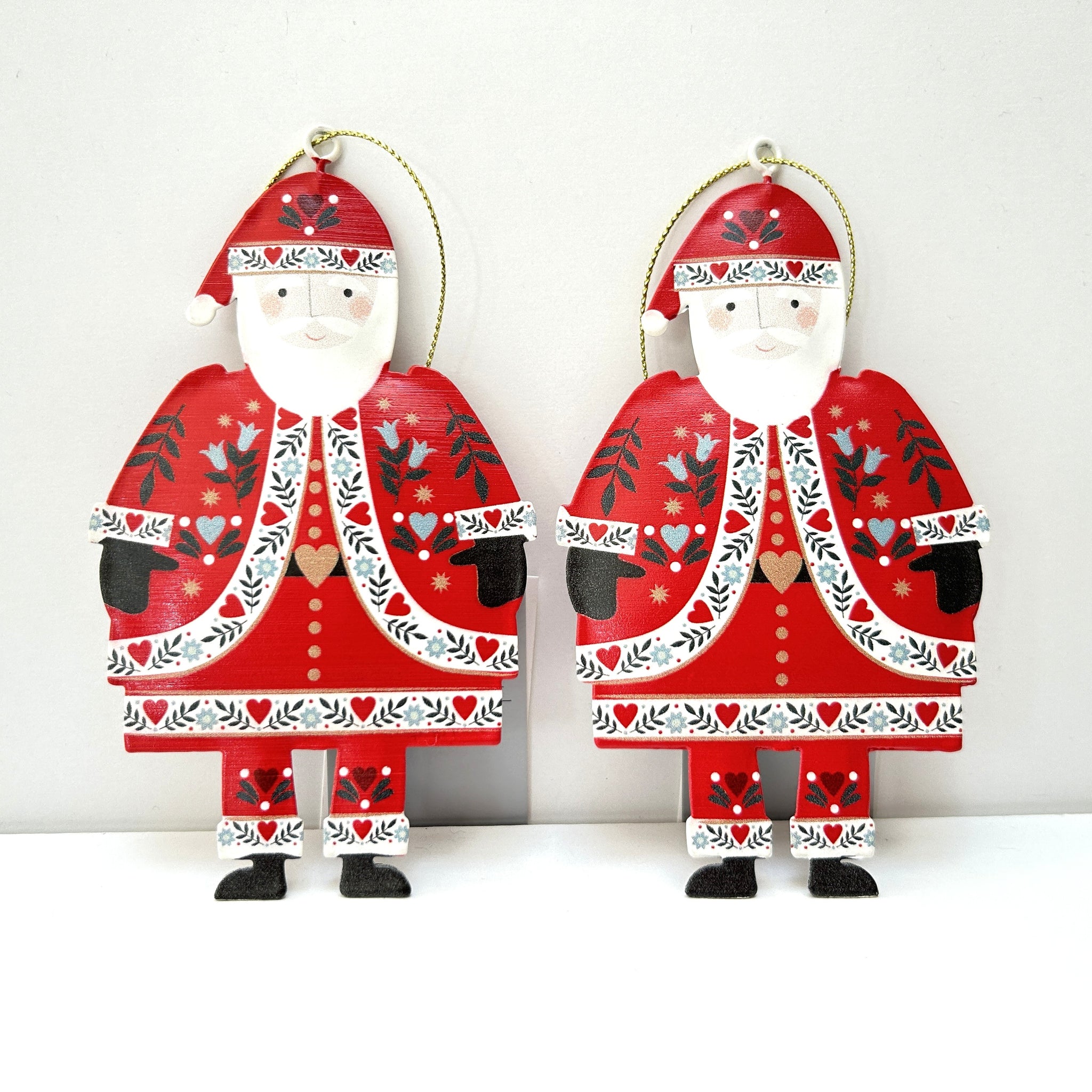 Bring a cheerful Alpine touch to your Christmas tree with this set of two tin Santa decorations. Each Santa is dressed in a bright red coat and hat, beautifully detailed with Scandinavian-inspired floral and heart motifs. The folk-art patterns and soft colours capture a cosy, rustic charm that perfectly complements both traditional and modern festive décor.