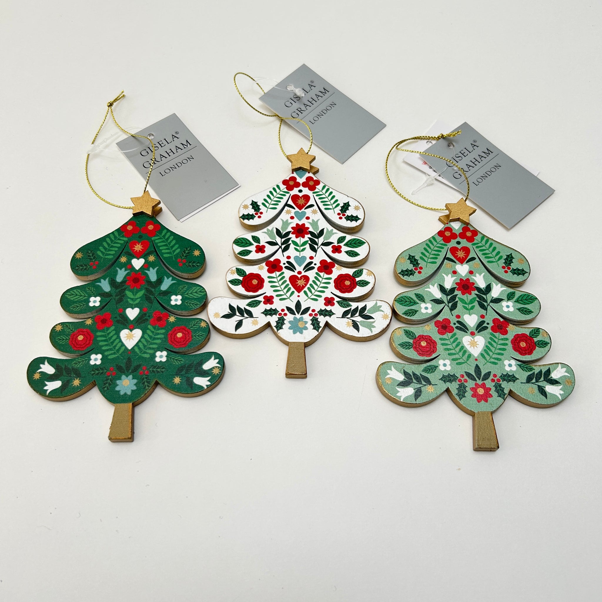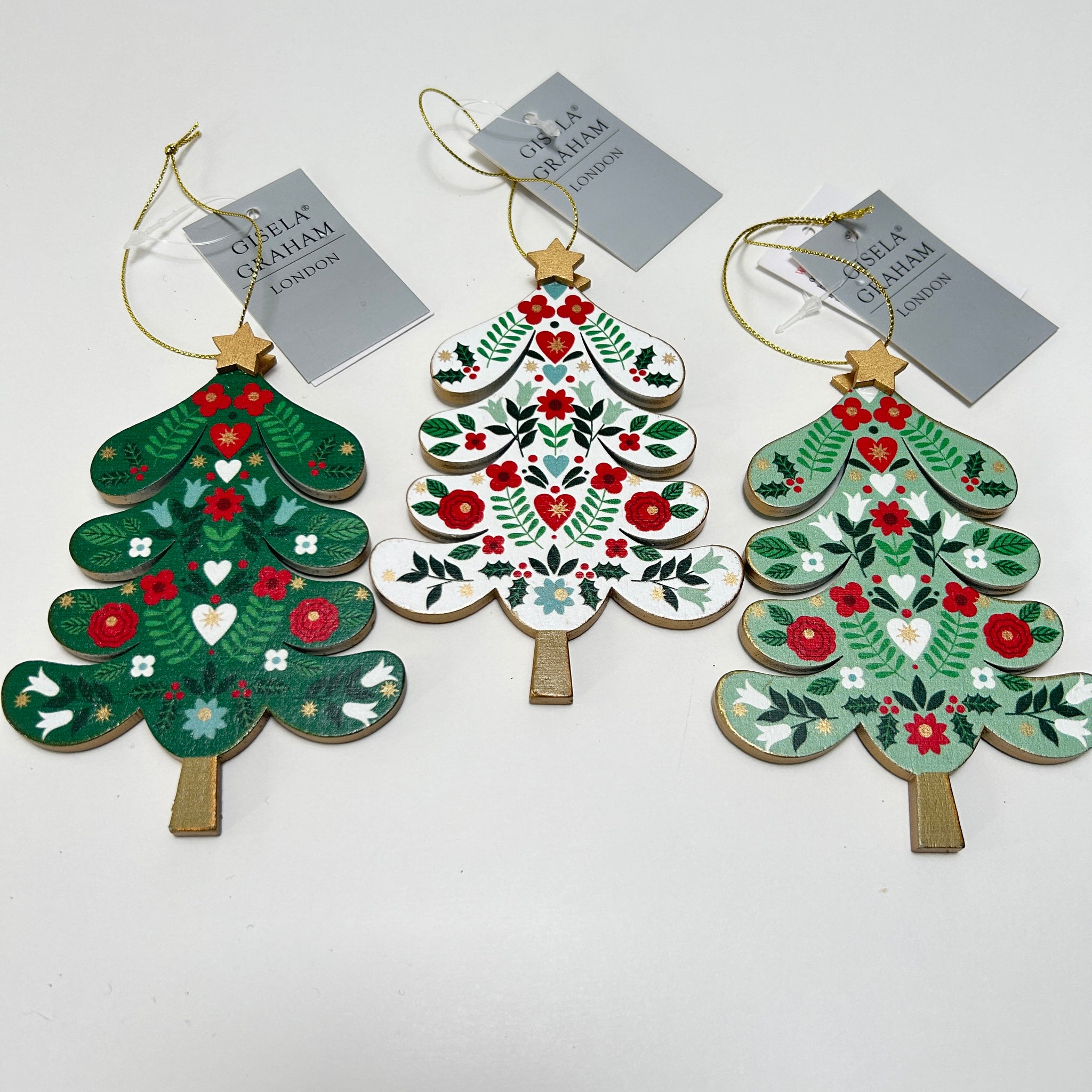 Bring a touch of Nordic charm to your holiday décor with this delightful Alpine Christmas Tree Decoration Set. This set of 3 features stylised tree-shaped ornaments in rich seasonal tones of white, mint green, and forest green, each adorned with intricate folk-art floral patterns and heart motifs. Accented with golden star toppers, these lightweight wooden decorations are perfect for Scandinavian Christmas themes.