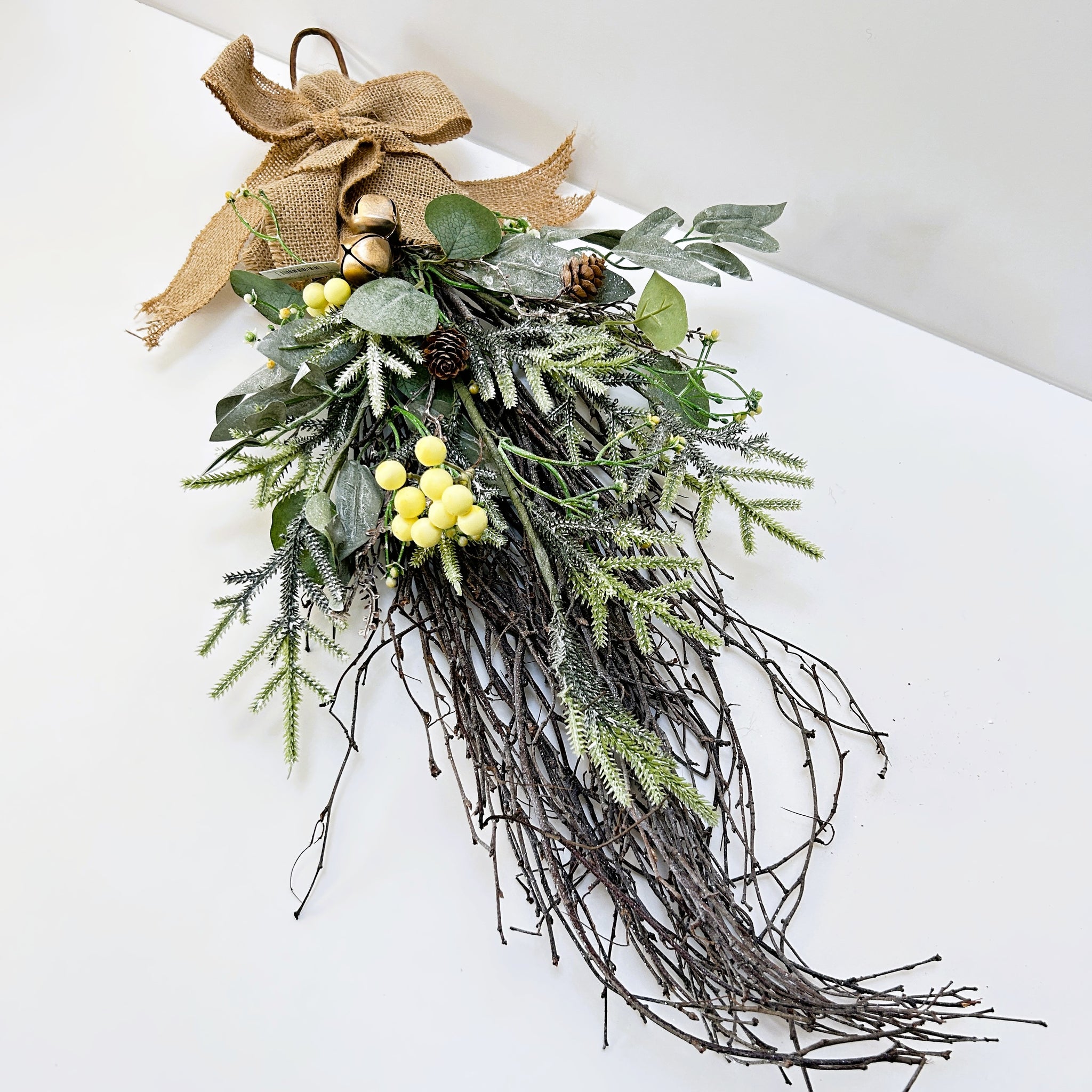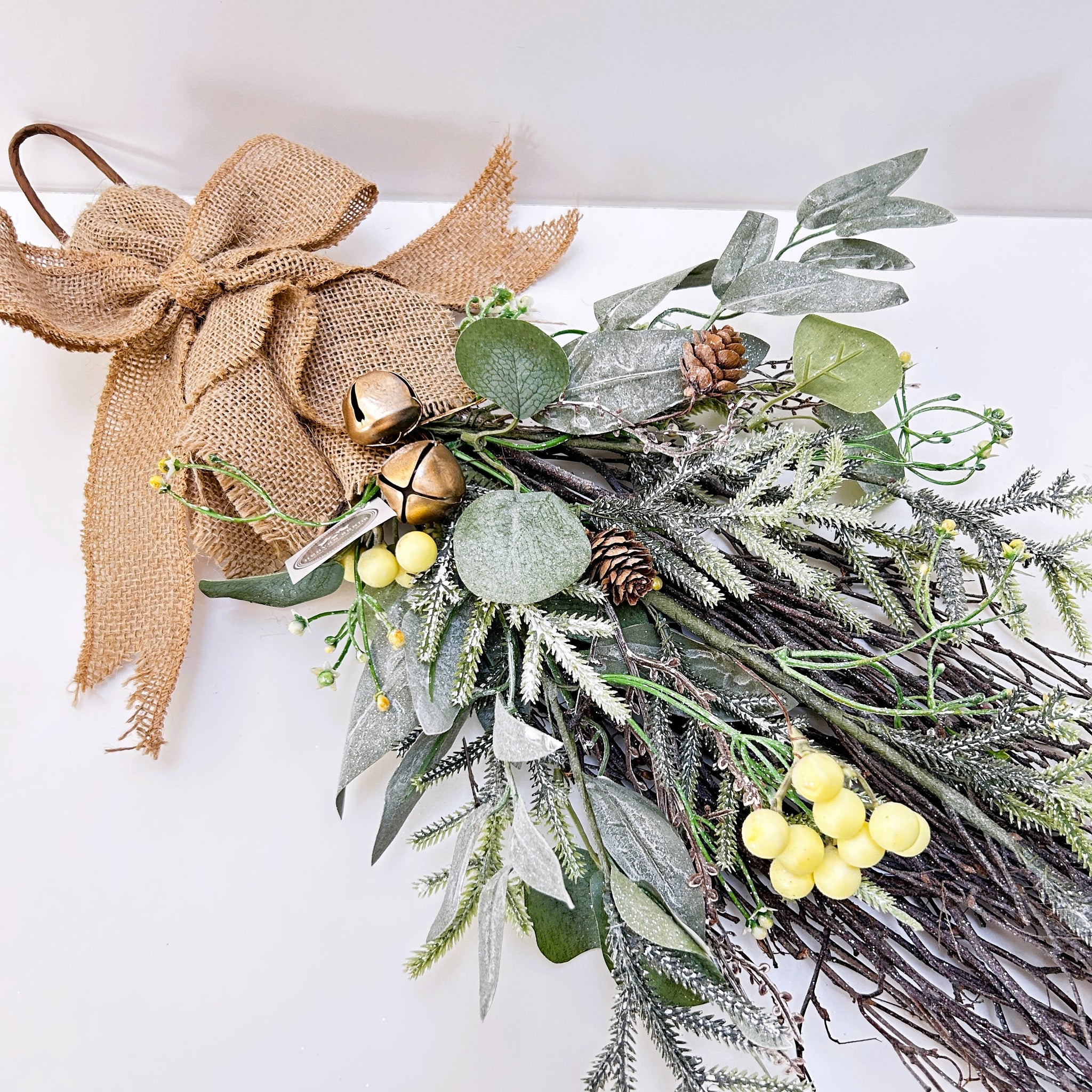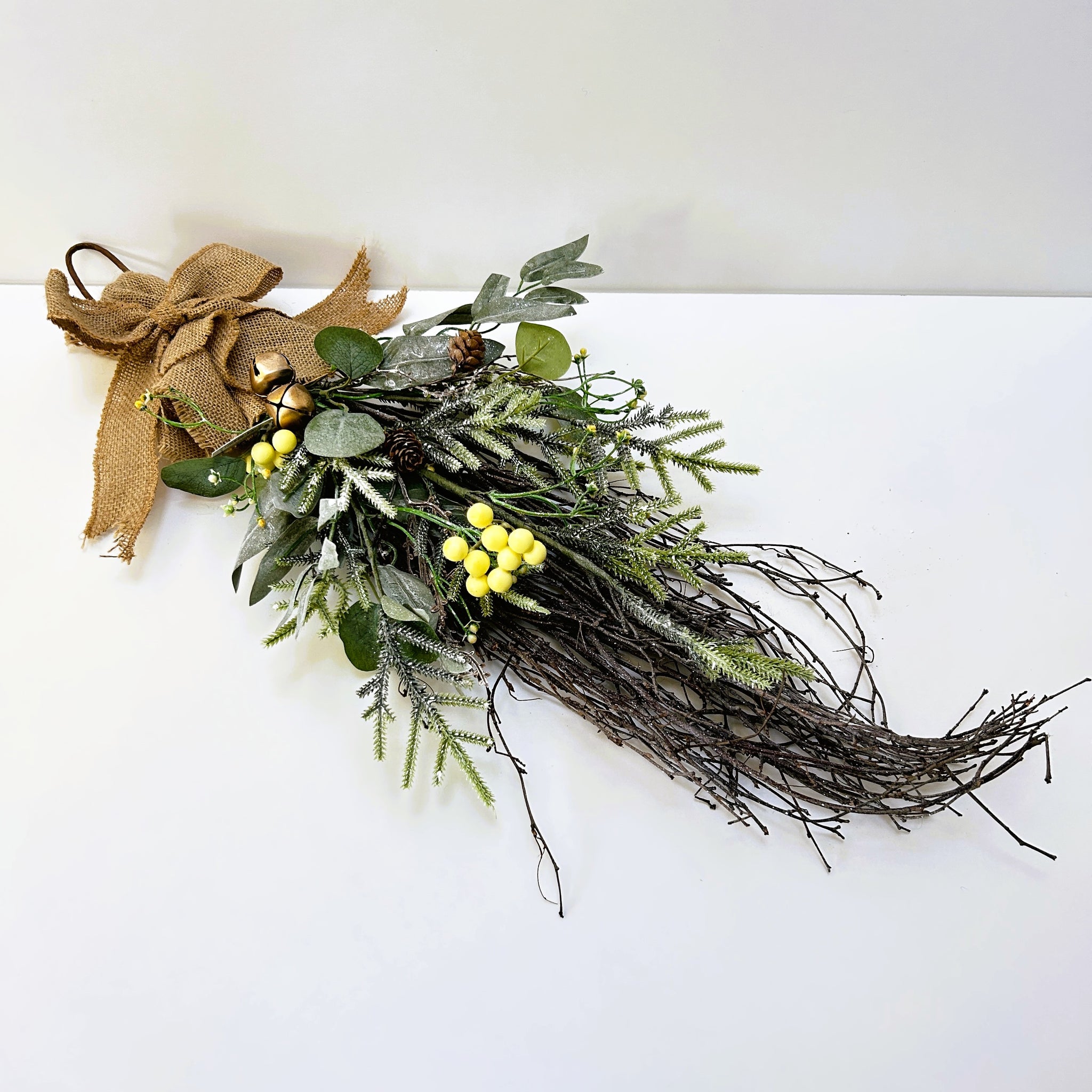 Bring a touch of rustic elegance to your festive home décor with this beautiful green decorative branch arrangement. Designed with a mix of lifelike greenery, frosted leaves, pinecones, and clusters of white berries, it captures the natural charm of a woodland Christmas. The arrangement is finished with a large hessian-style bow for a warm, rustic touch.