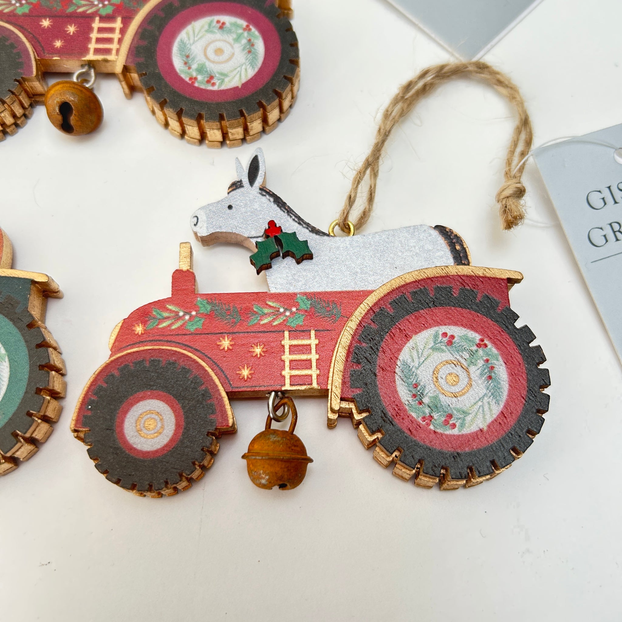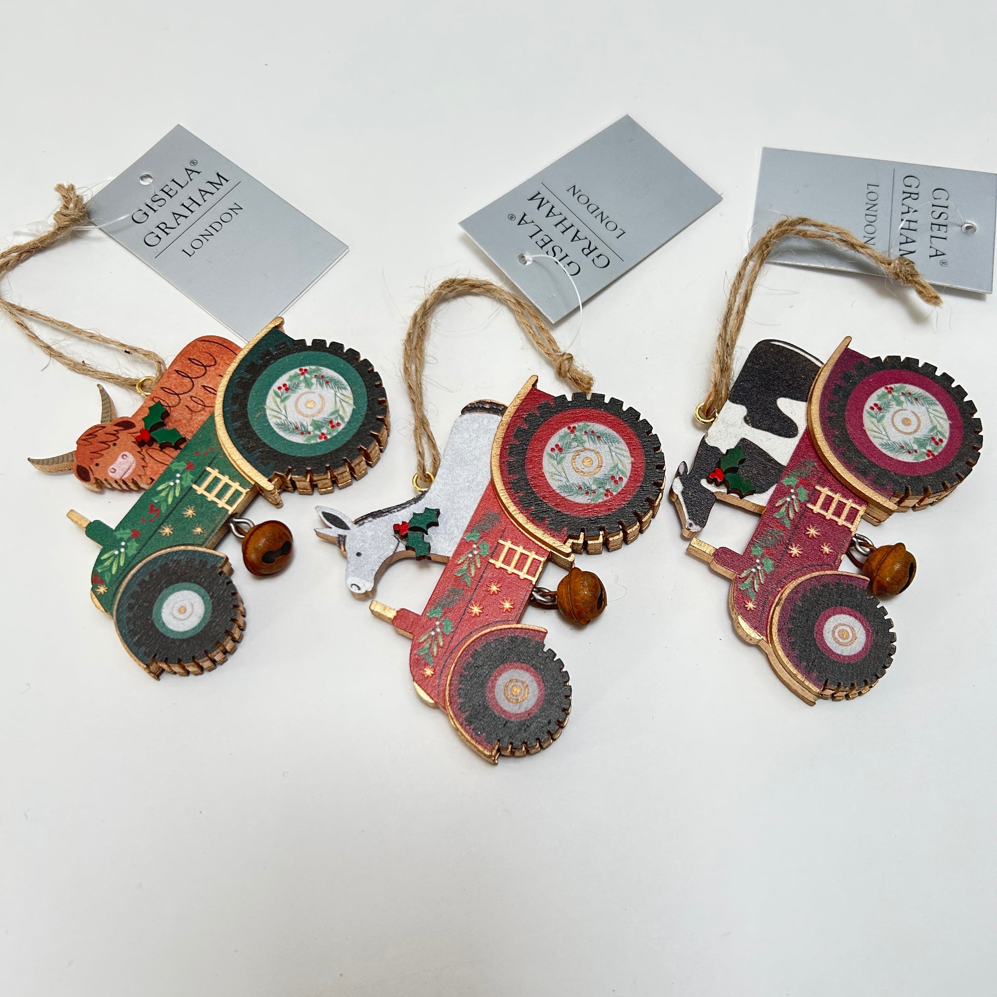 Celebrate Christmas country-style with this delightful set of three wooden Christmas decorations. Featuring a donkey, a Highland cow, and a dairy cow each riding their own festive tractor, these ornaments are decorated with holly, Christmas presents, and a rustic hanging jute string. A small wooden bell hangs from each tractor for added charm.