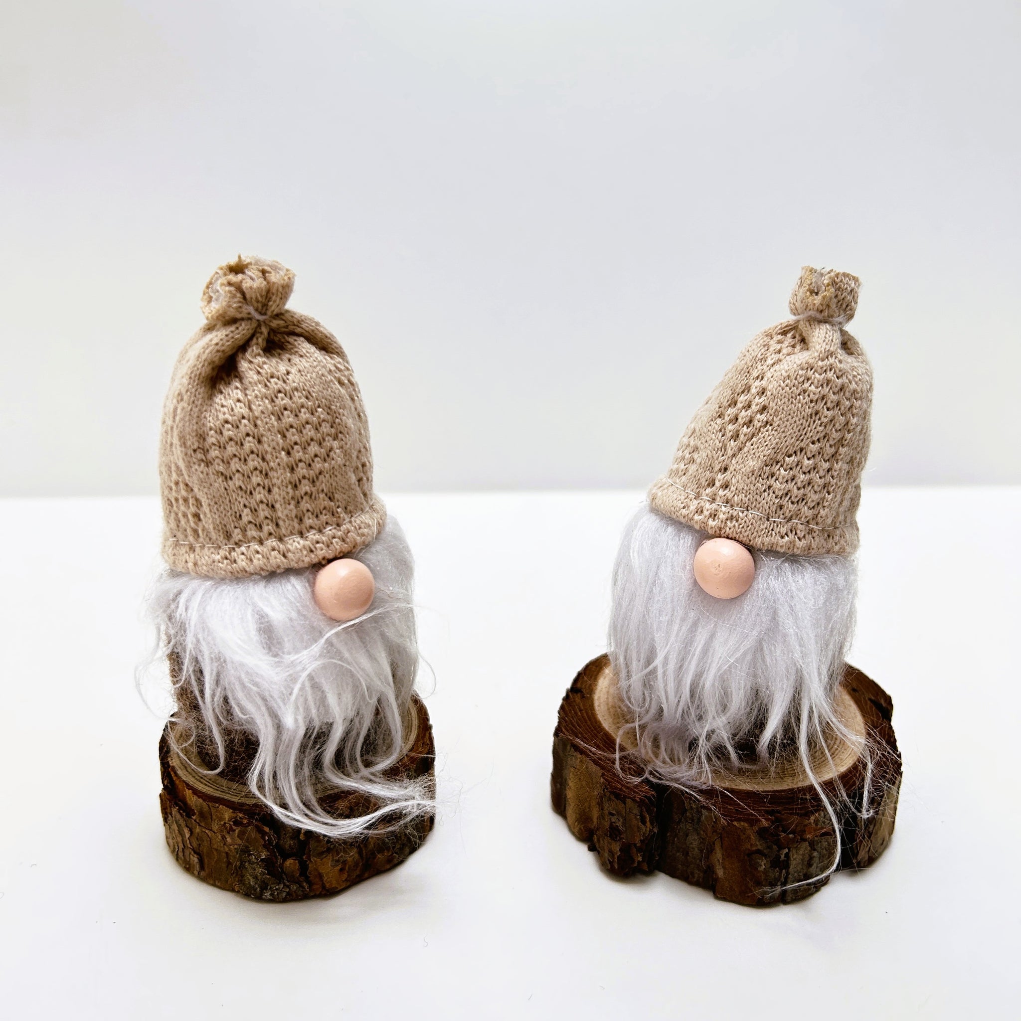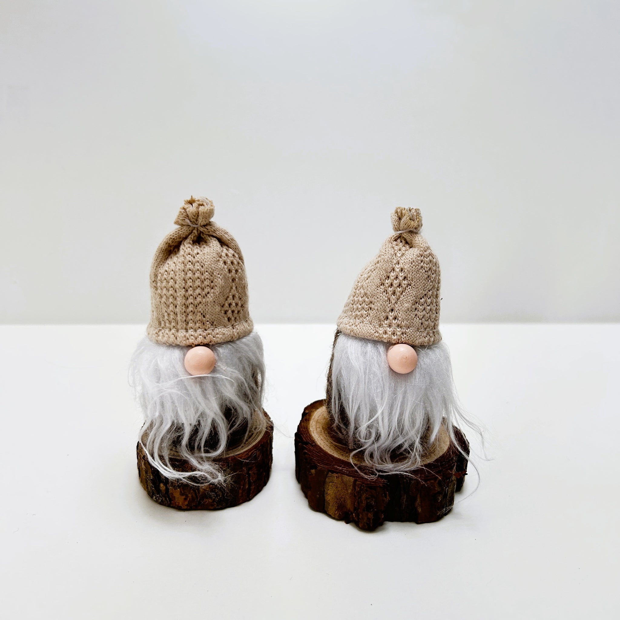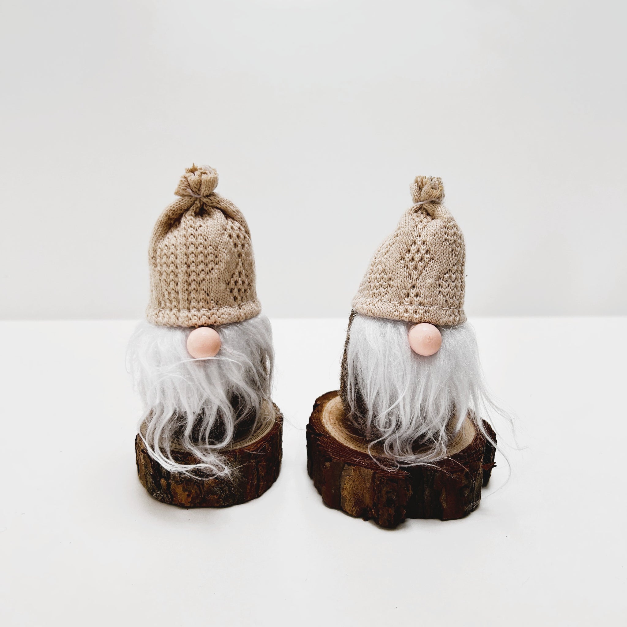 Add a touch of rustic charm to your festive décor with this delightful set of two mini gonks, each sitting on a natural wooden log base. With their cosy knitted hats, long flowing beards, and classic Scandi-inspired design, these gonks bring warmth and character to any Christmas display.