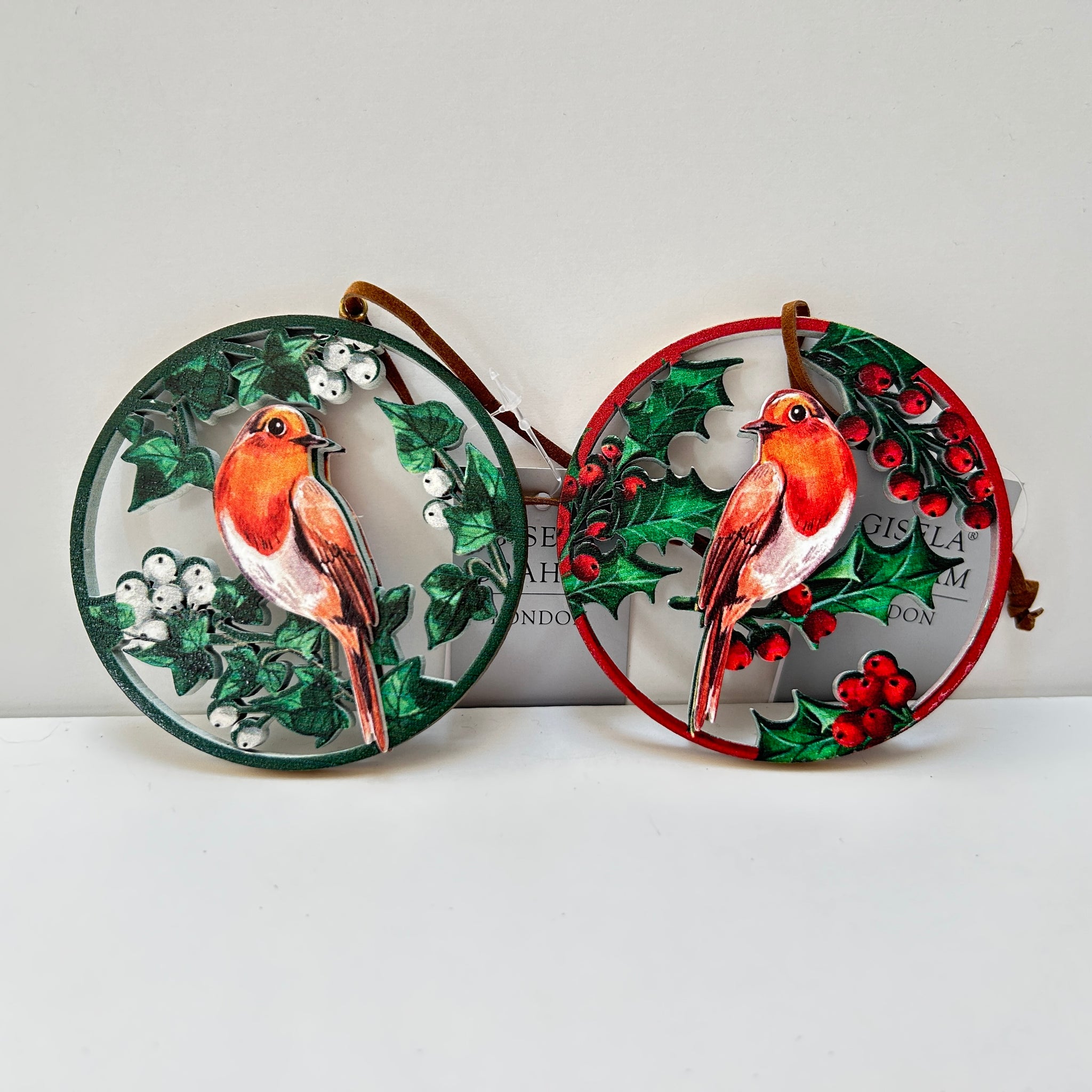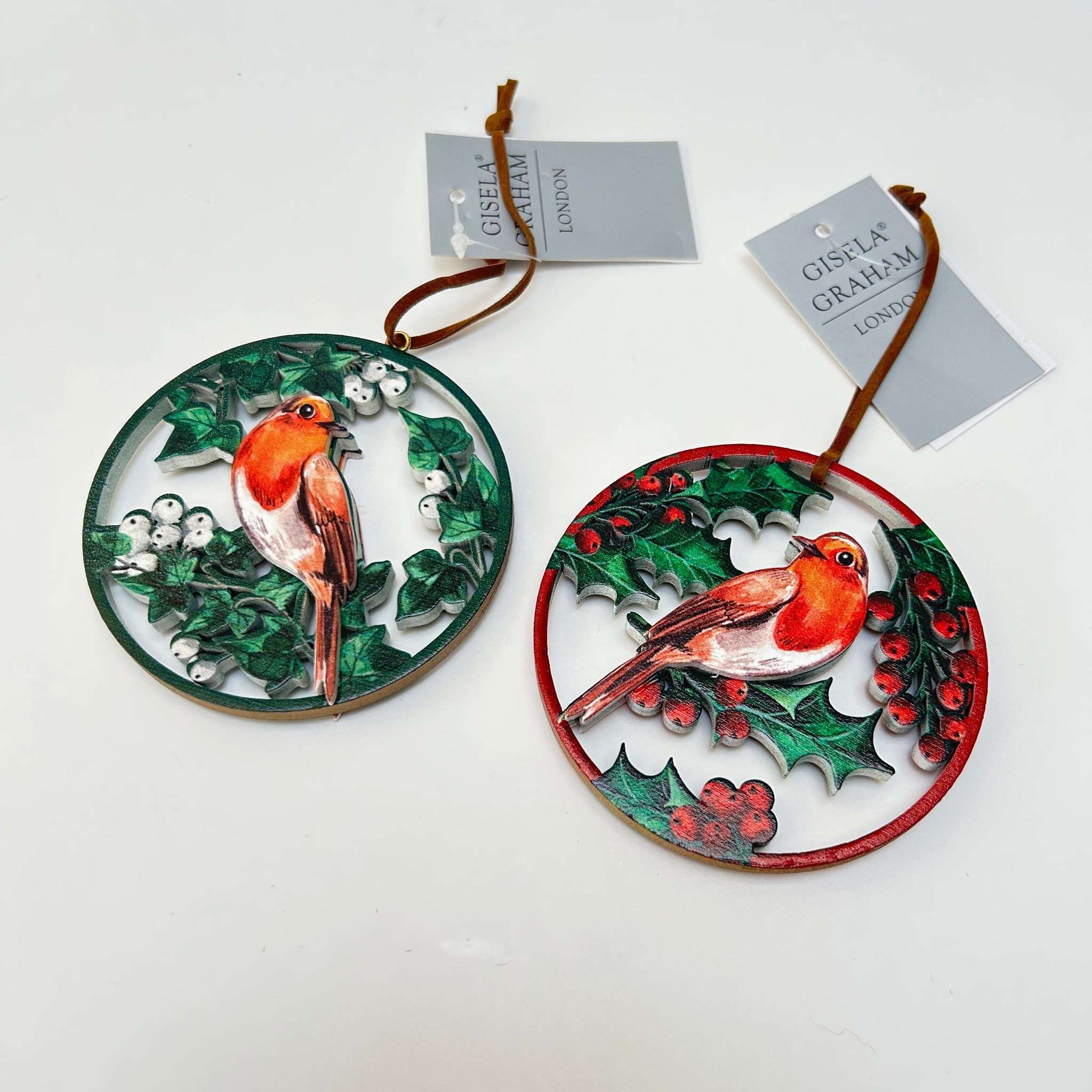 Bring the beauty of nature to your festive décor with this set of 2 wooden fretwork robin decorations. Each design features a traditional red-breasted robin perched amongst holly and ivy, framed within a circular cut-out design.