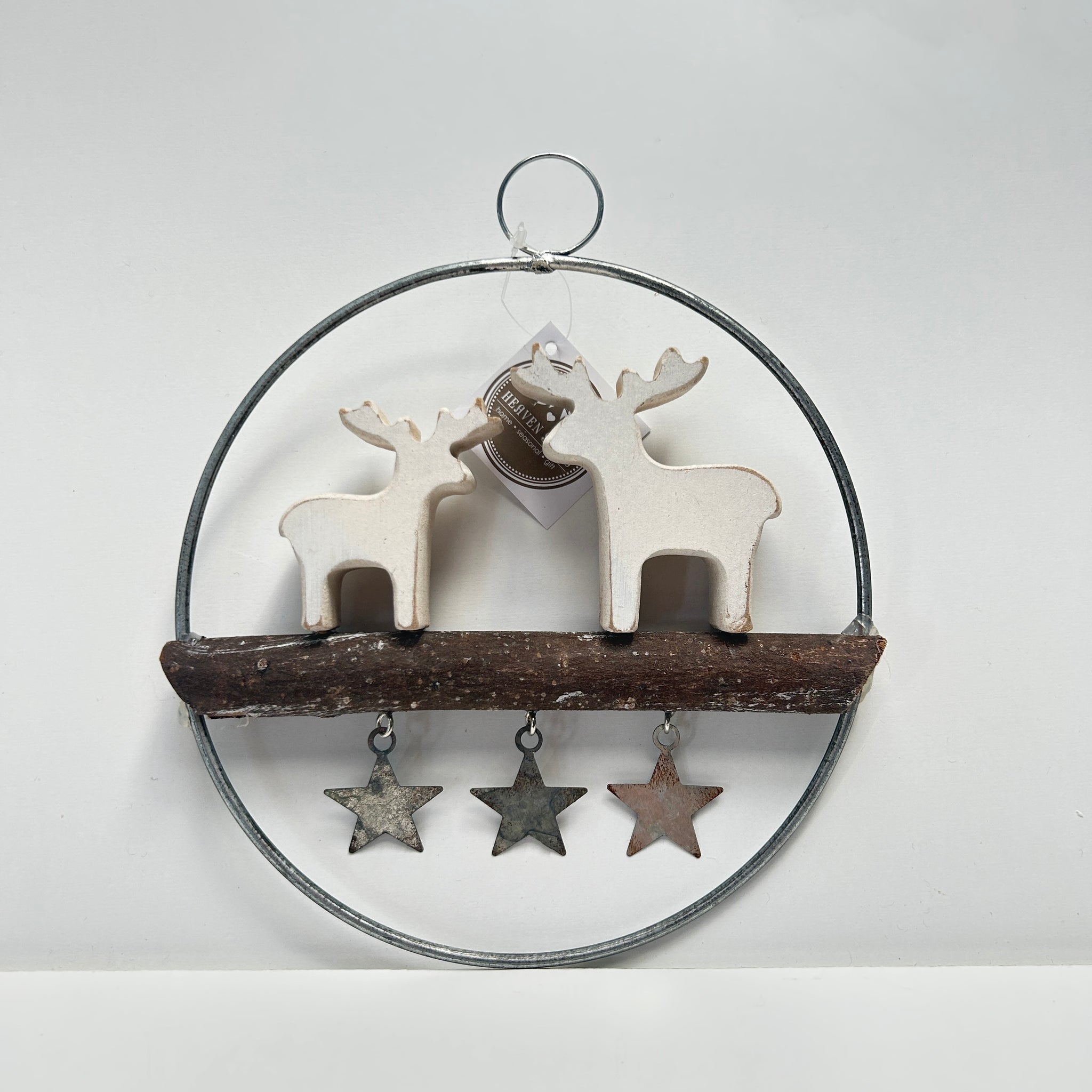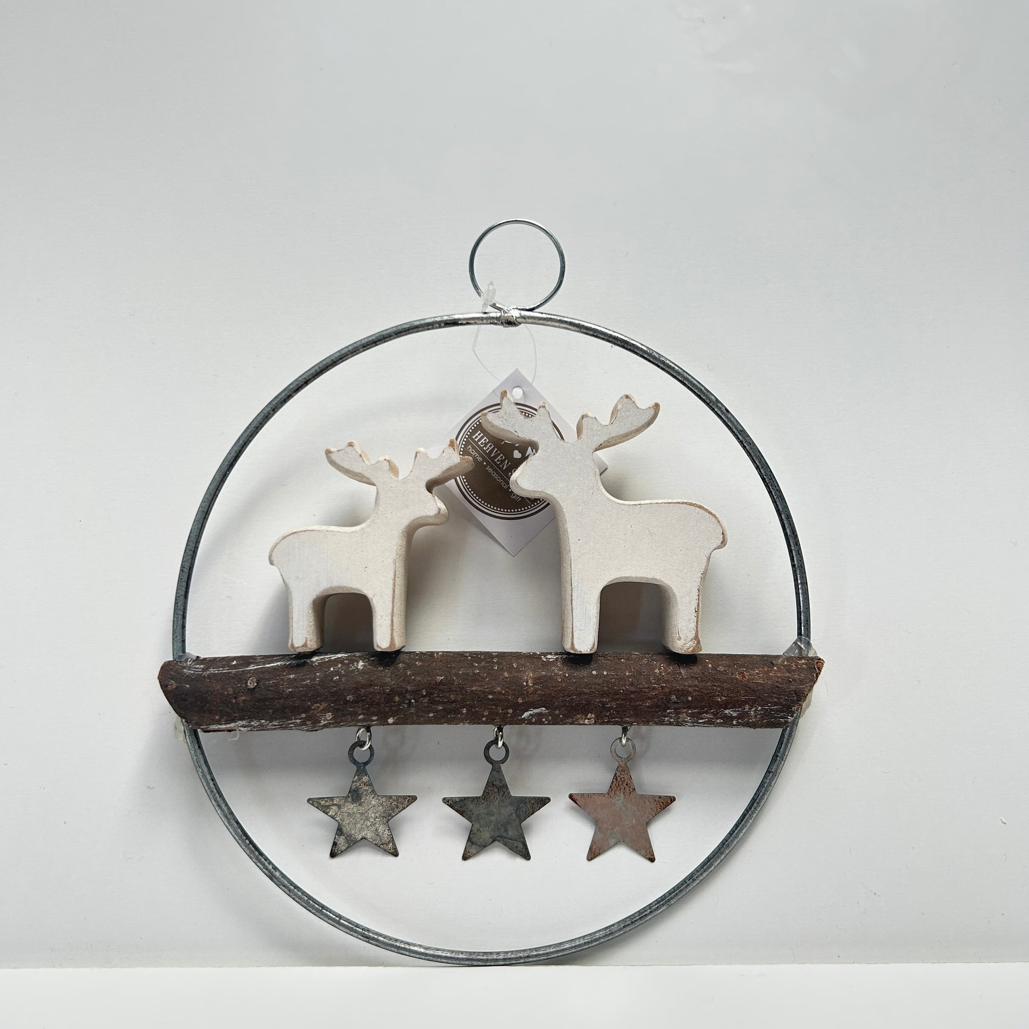Add a touch of rustic woodland charm to your festive décor with this reindeer scene decoration. The design features two carved wooden reindeer, beautifully set within a round silver-toned metal frame. They stand on a natural wooden branch, while three hanging metal stars dangle below, catching the light and adding a subtle shimmer.