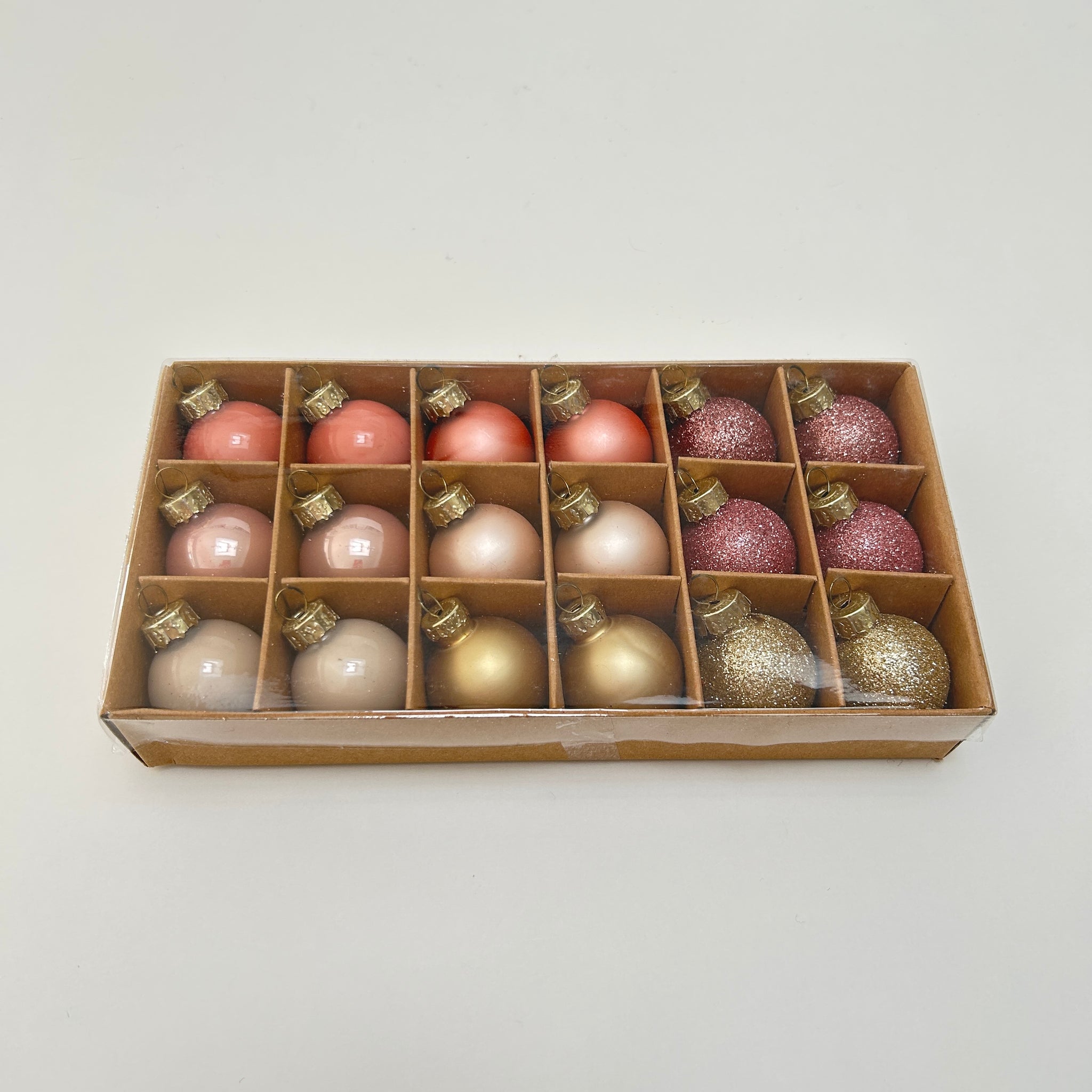 Add a soft and stylish touch to your Christmas décor with this box of mini pink glass baubles. Each set includes a beautiful mix of finishes, shiny, matte, and glitter, in shades ranging from delicate blush to rich rose pink. The variety of textures catches the light perfectly, creating a subtle sparkle and a chic, coordinated look on your tree.