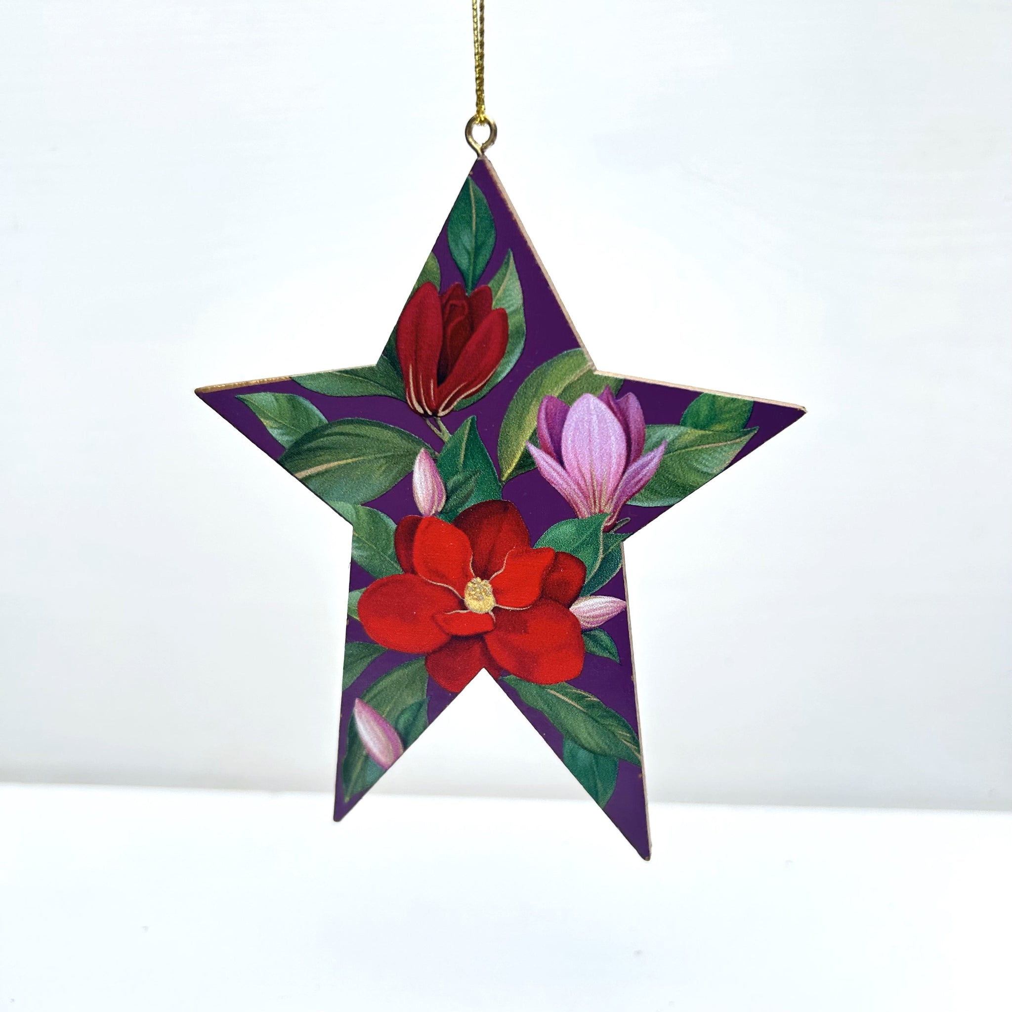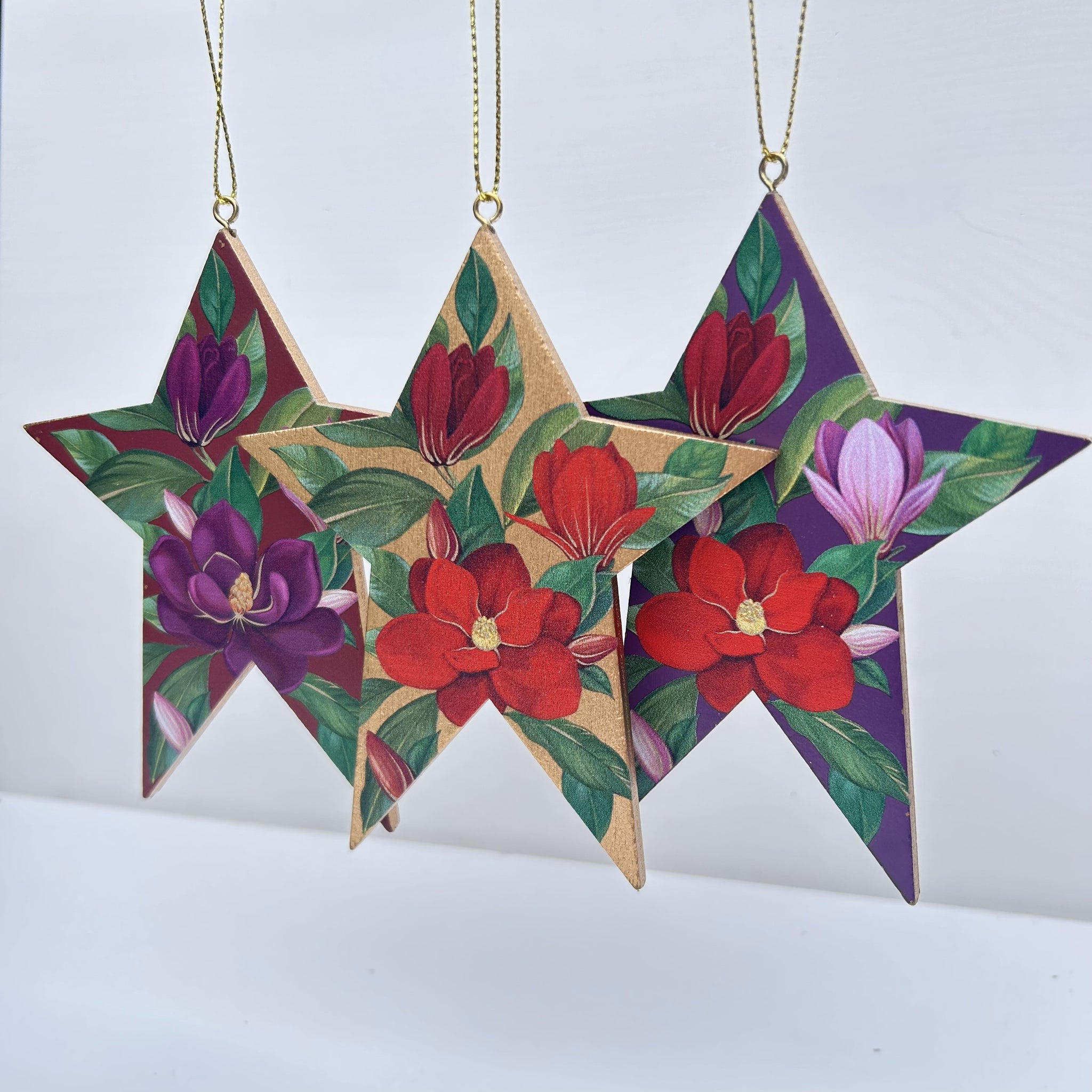This gorgeous set of 3 wooden Christmas star decorations from Gisela Graham are very on-trend this season. Hanging from gold thread, they are decorated with red, purple and gold magnolias.