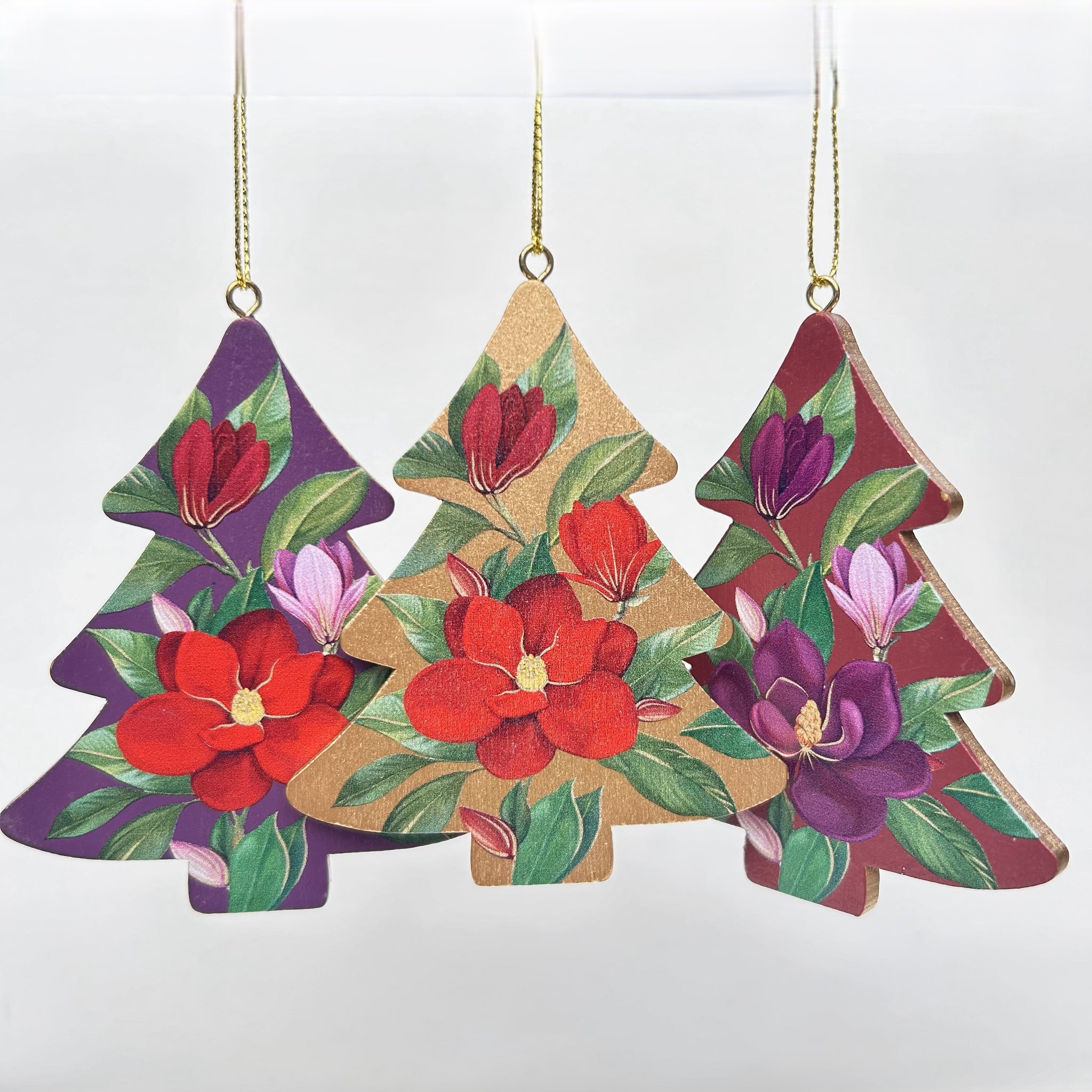 This gorgeous set of 3 wooden Christmas tree decorations from Gisela Graham are very on-trend this season. Hanging from gold thread, they are decorated with red, purple and gold magnolias.