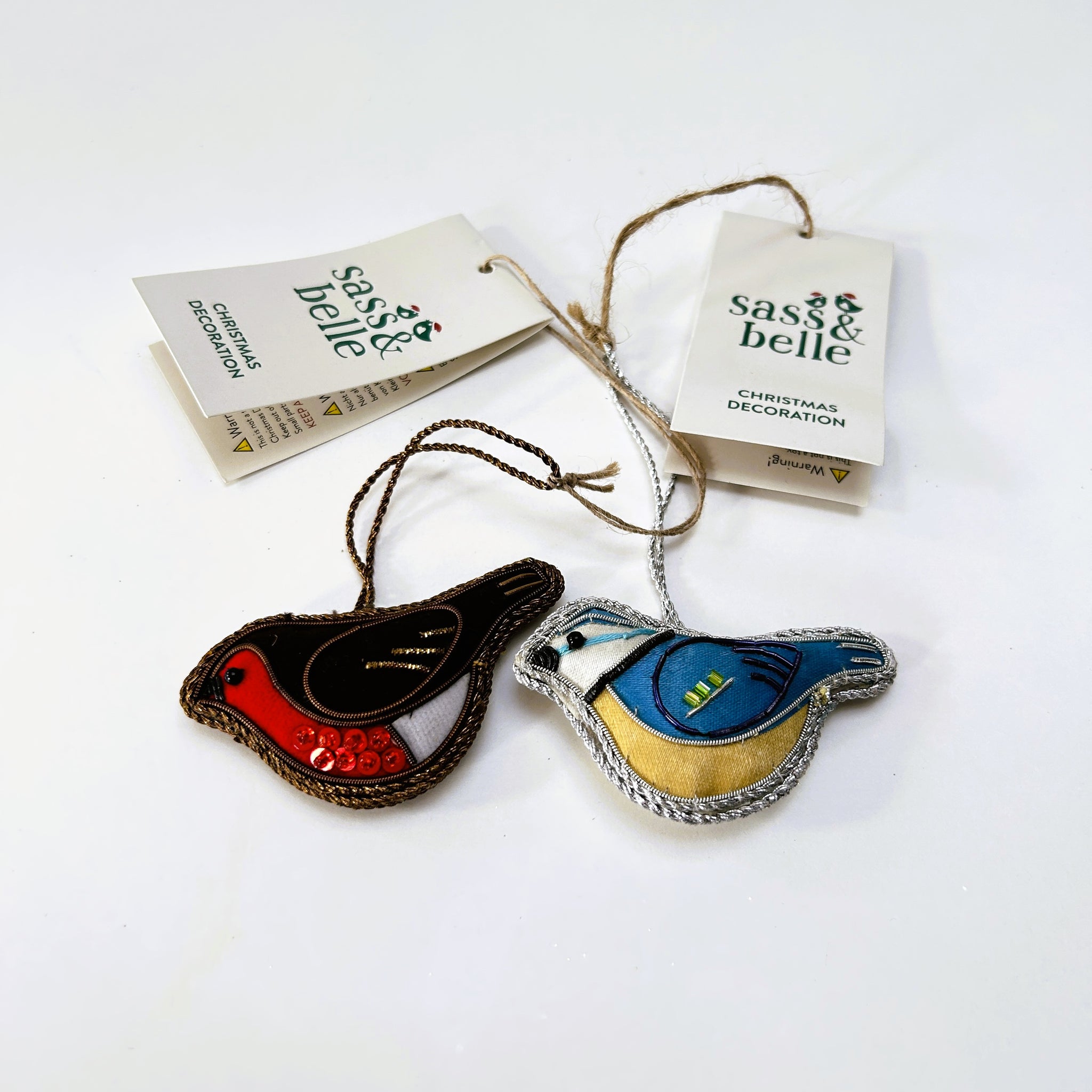 Bring a touch of nature to your festive décor with this charming set of embroidered bird decorations. Featuring a classic robin with its bright red breast and a beautifully detailed blue tit in vibrant blue and yellow, each bird is finished with metallic thread edging and a matching hanging loop. Perfect for smaller trees or adding a delicate accent to garlands and wreaths.