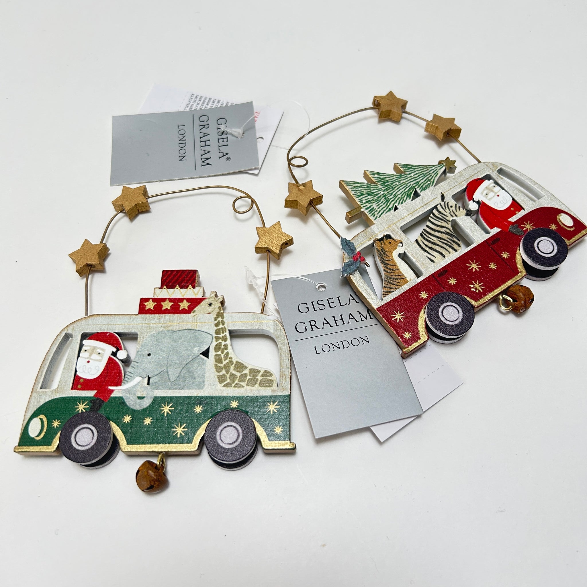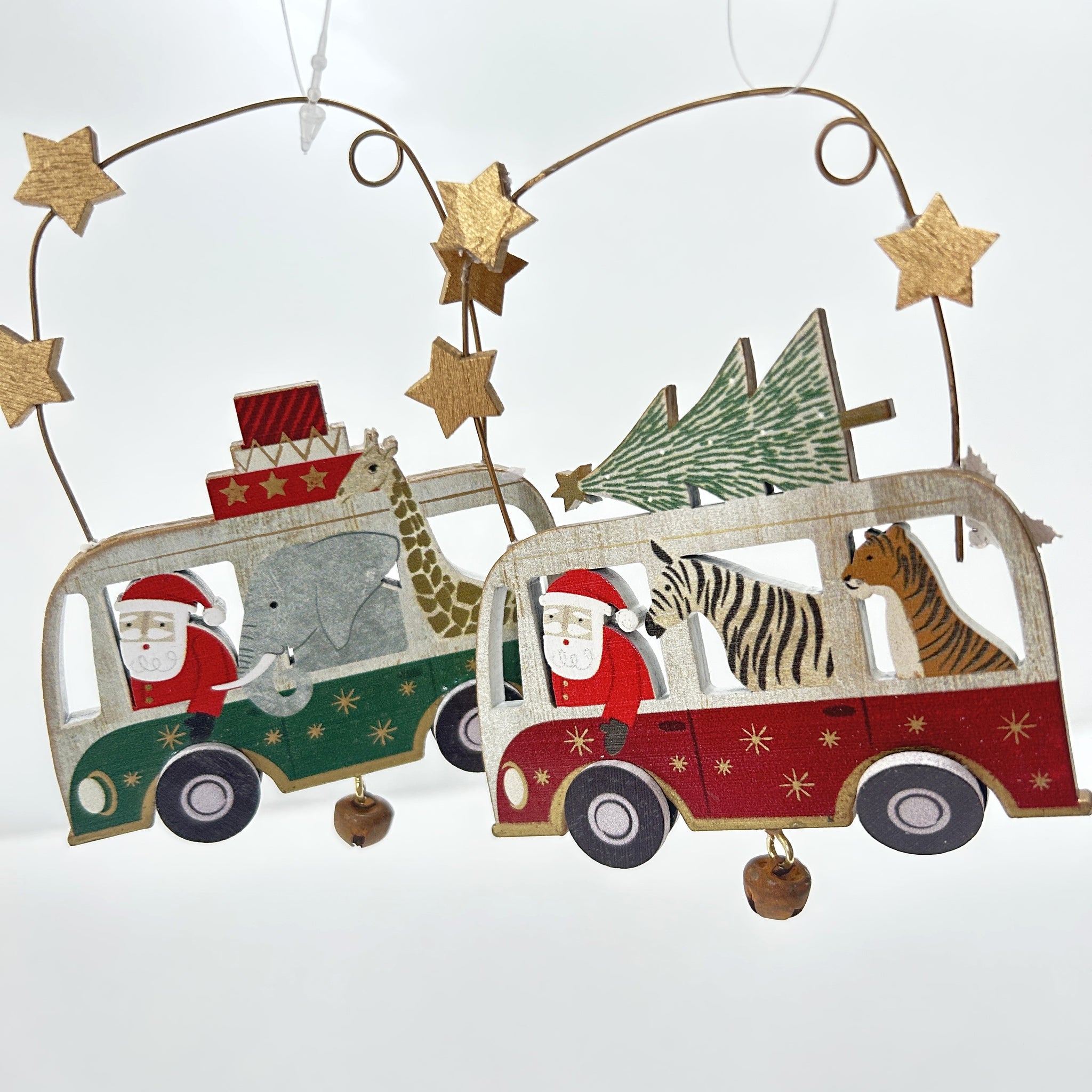 A joyful pair of wooden hanging decorations by Gisela Graham, featuring Santa driving festive buses filled with safari animals! One bus carries a giraffe and elephant with presents on the roof, while the other features a zebra and tiger with a Christmas tree on top.