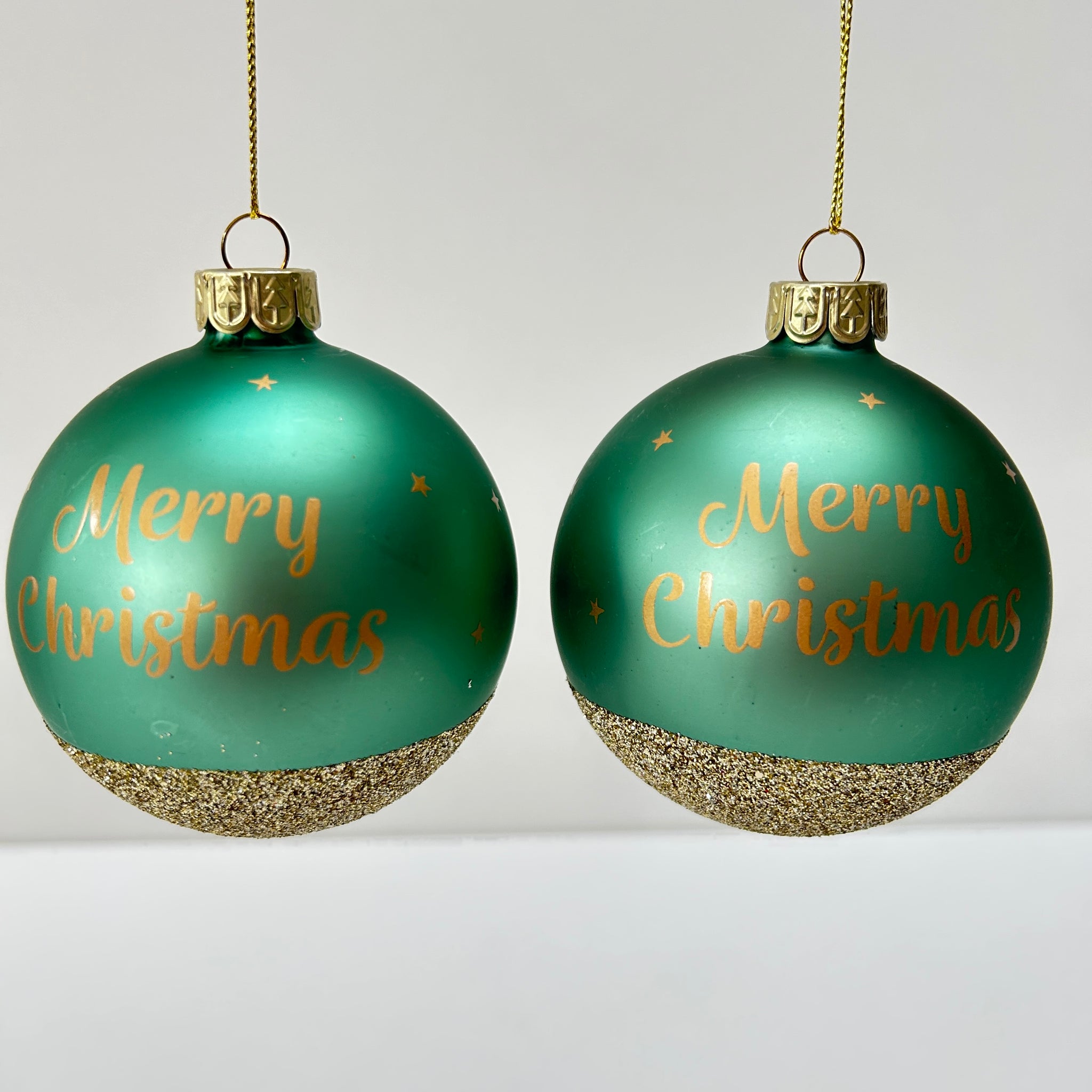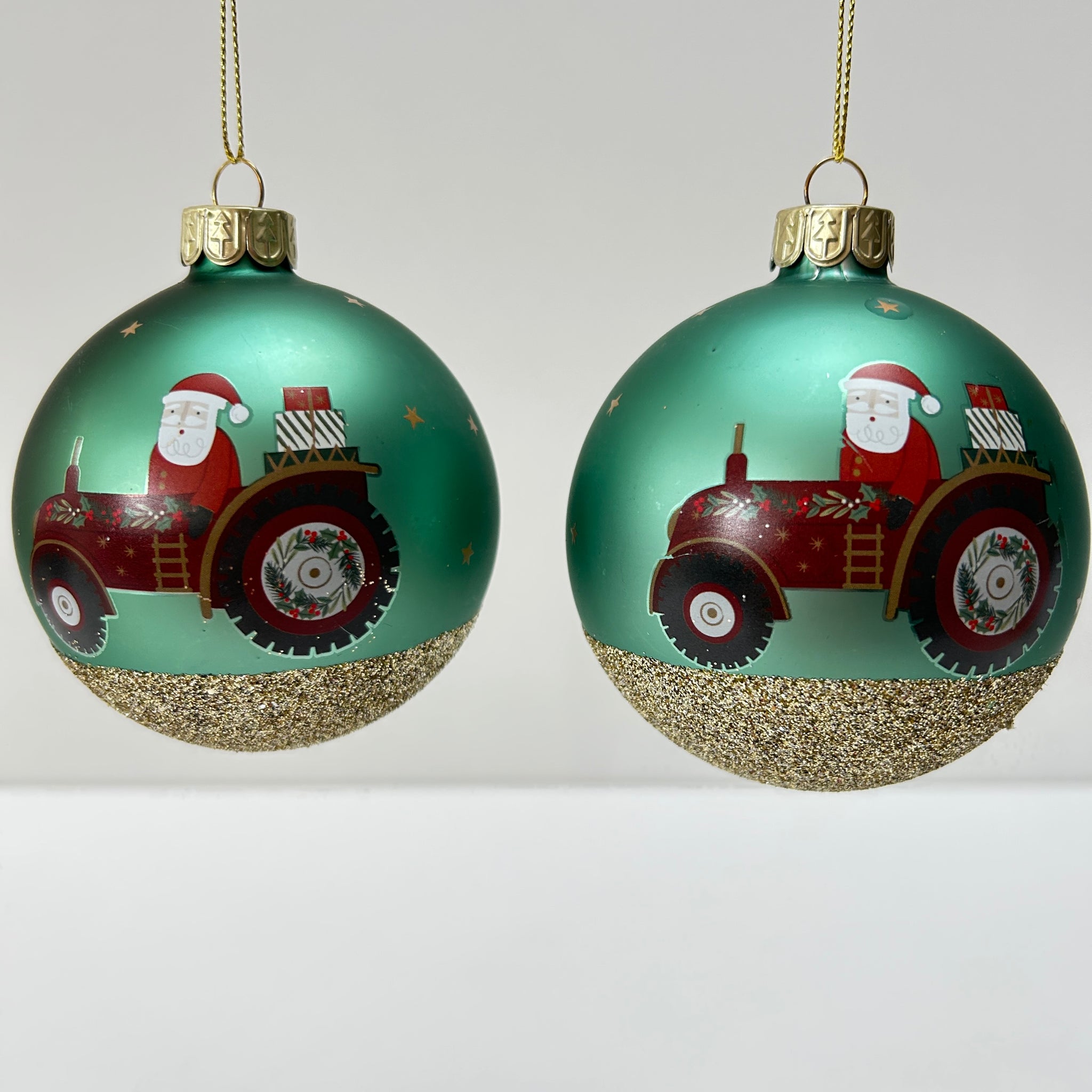 Add a festive countryside twist to your Christmas décor with this charming Santa on Tractor Glass Bauble. Featuring a cheerful Santa driving a red tractor loaded with presents on one side, and a bold gold "Merry Christmas" greeting on the other, this bauble brings playful rural charm to your tree. The soft matte green finish is complemented by a dazzling band of gold glitter at the base, adding a touch of sparkle. Perfect for farm-themed trees, children's decorations, or anyone who loves a quirky take on tradition!