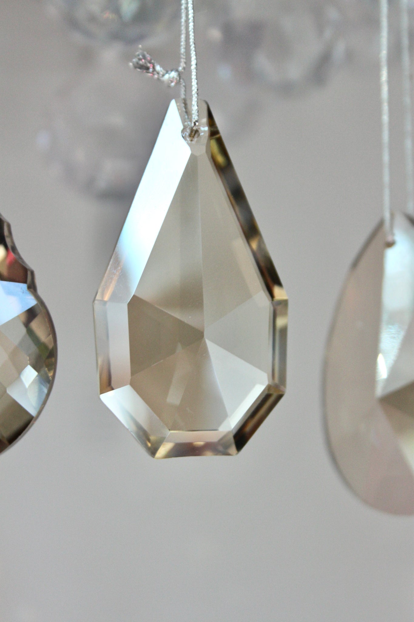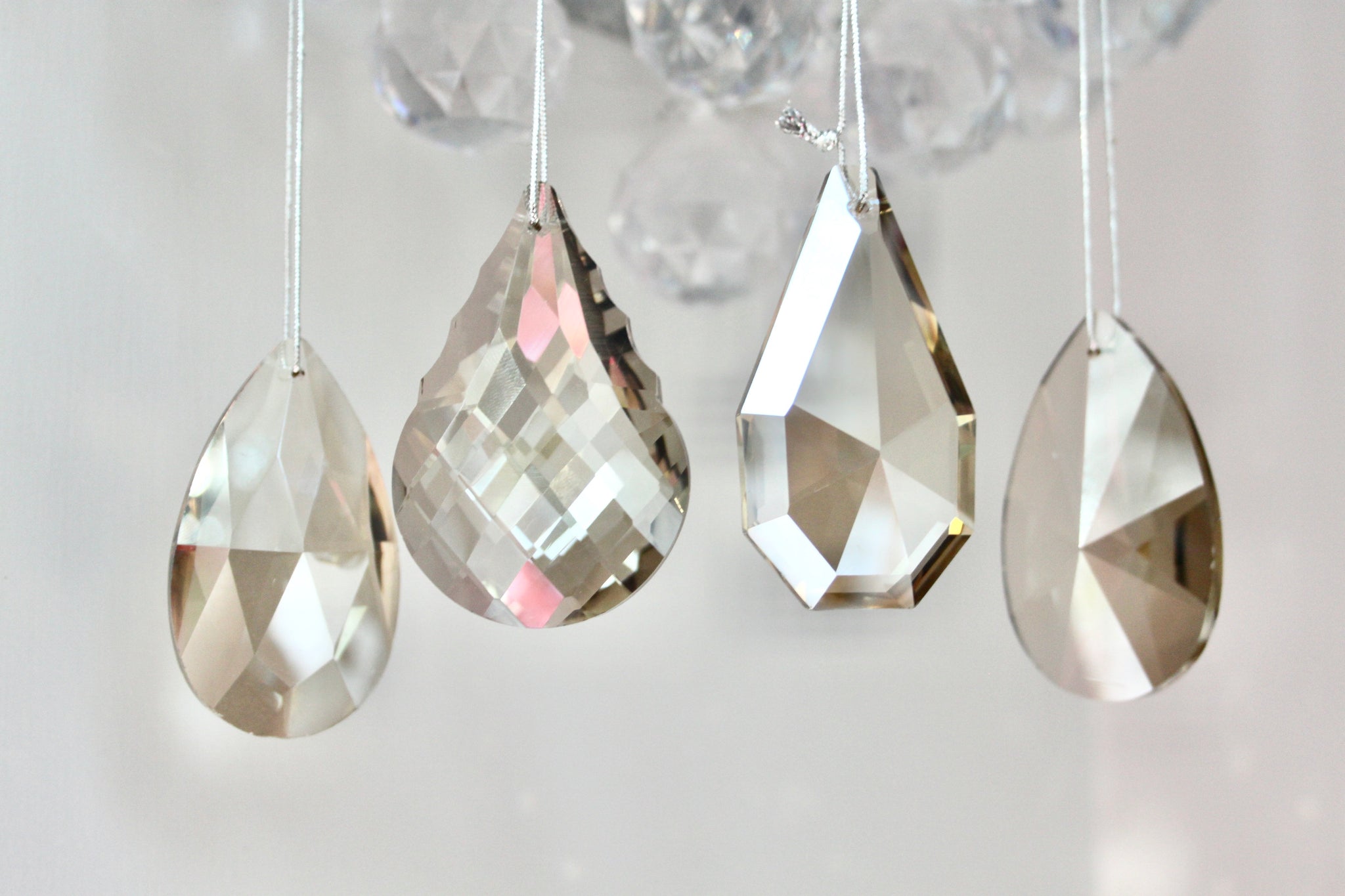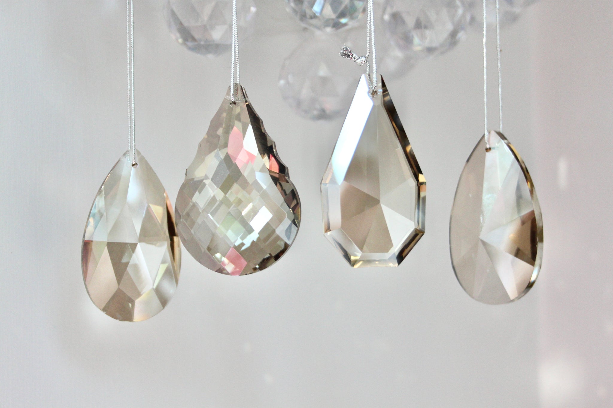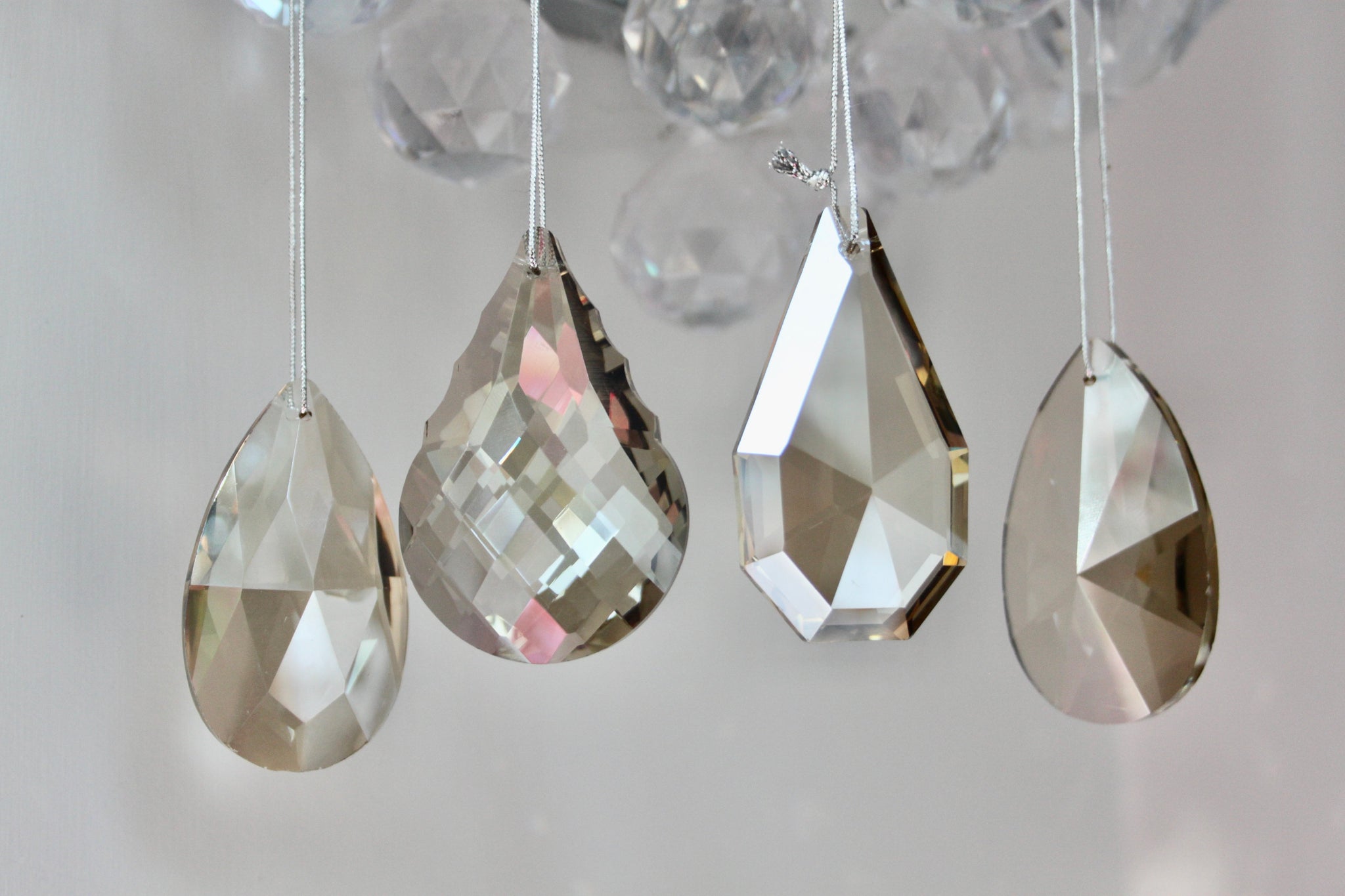 Stunning smoked glass crystal decorations - beautiful additions for the Christmas tree. Sold in a set of 4 - 2 x pear drop designs and 2 x tear drop design. For info, the pear drop design includes the crystal with the most cuts in the glass.