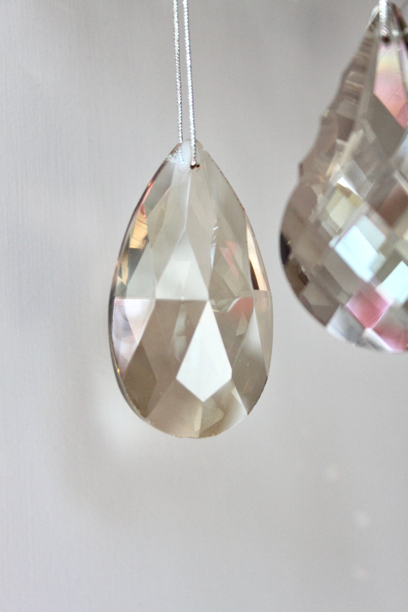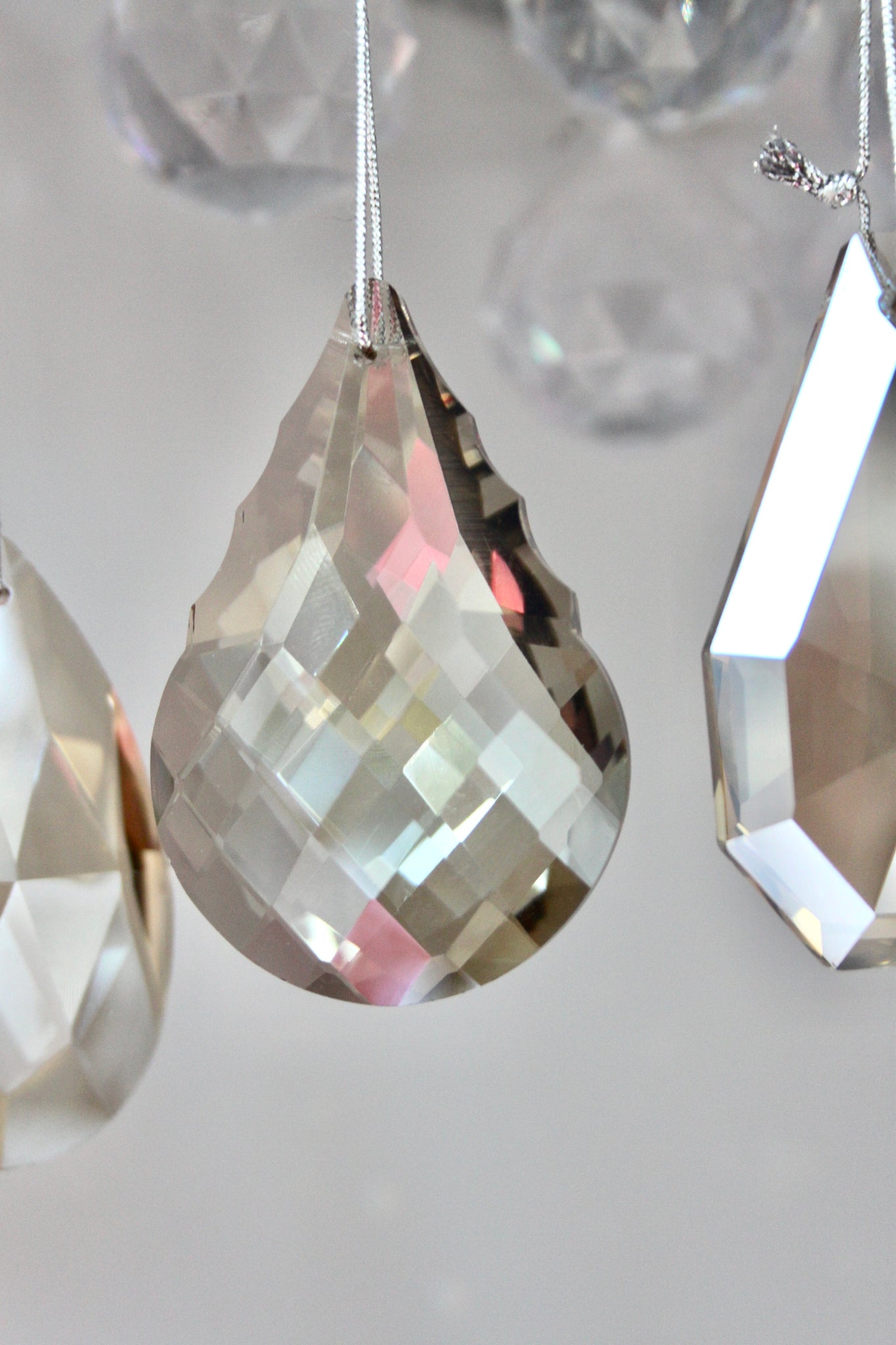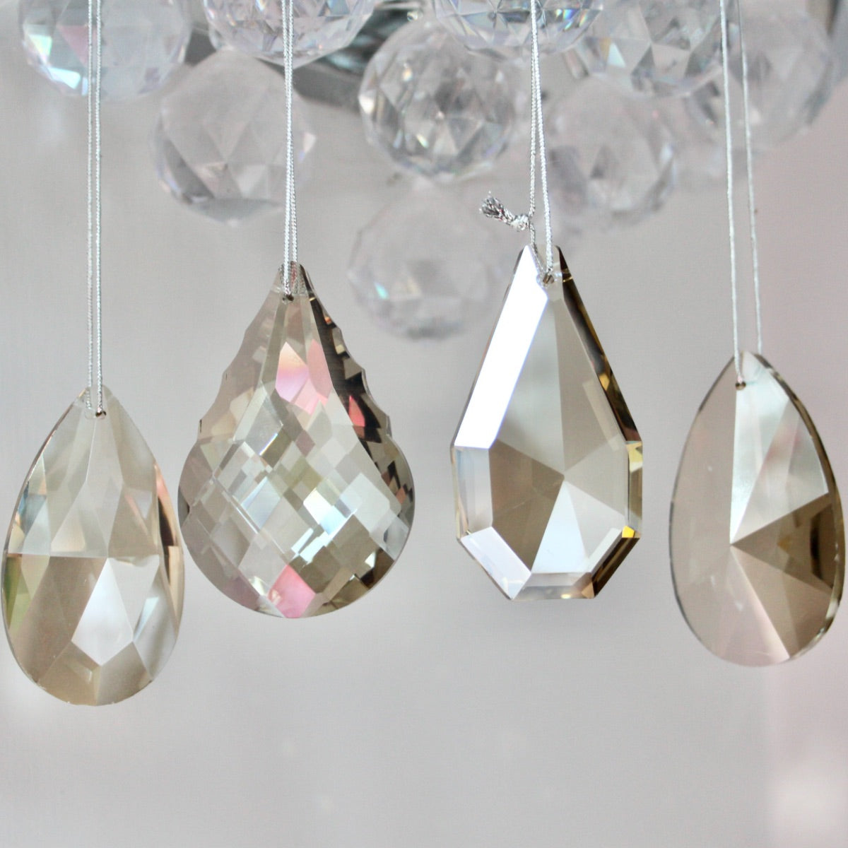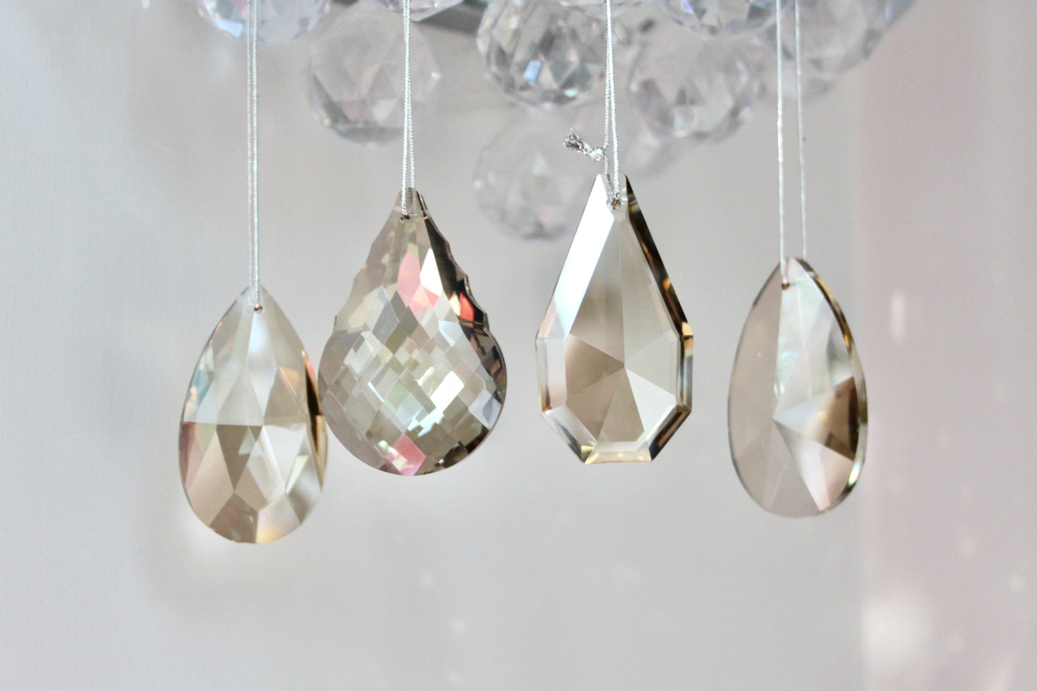Stunning smoked glass crystal decorations - beautiful additions for the Christmas tree. Sold in a set of 4 - 2 x pear drop designs and 2 x tear drop design. For info, the pear drop design includes the crystal with the most cuts in the glass.