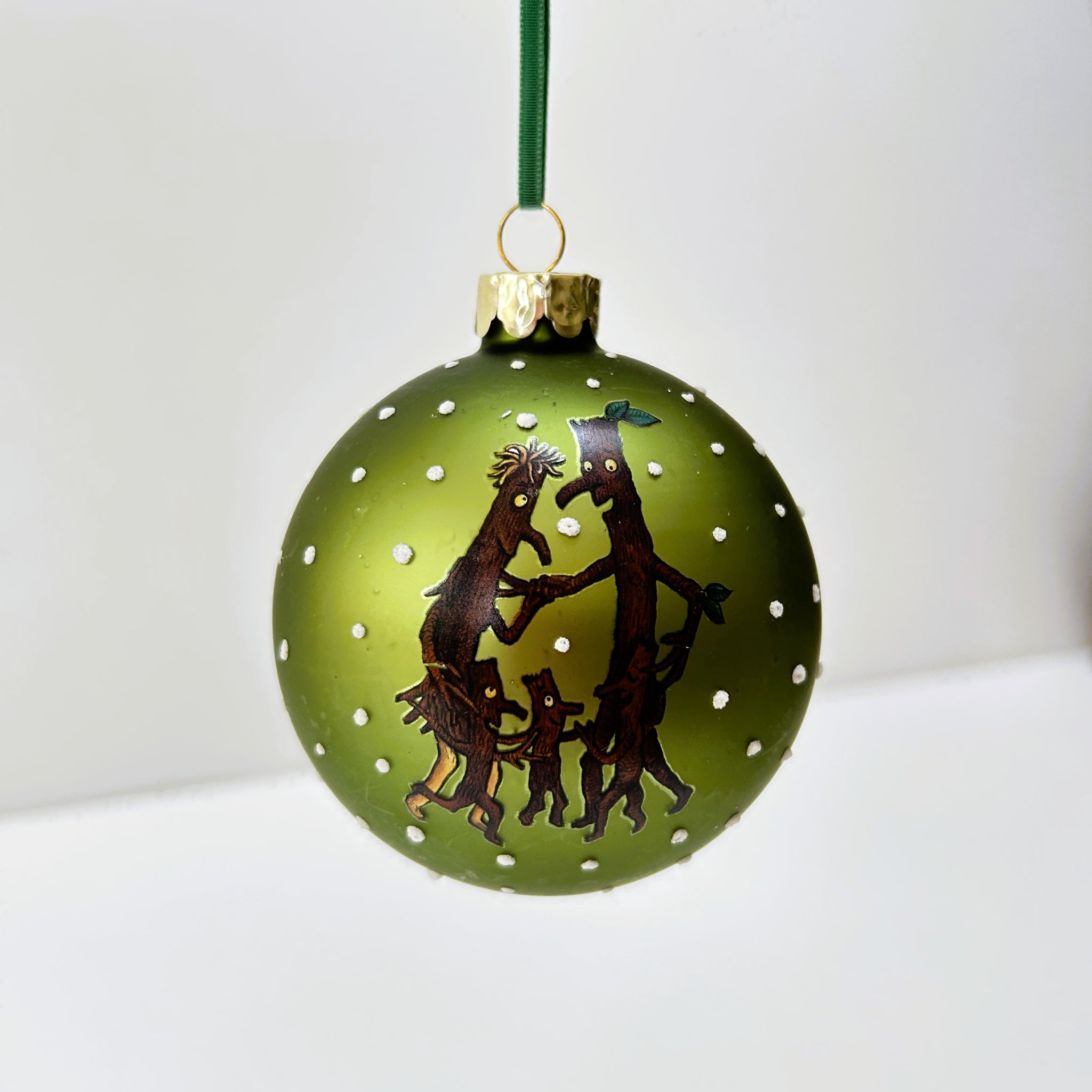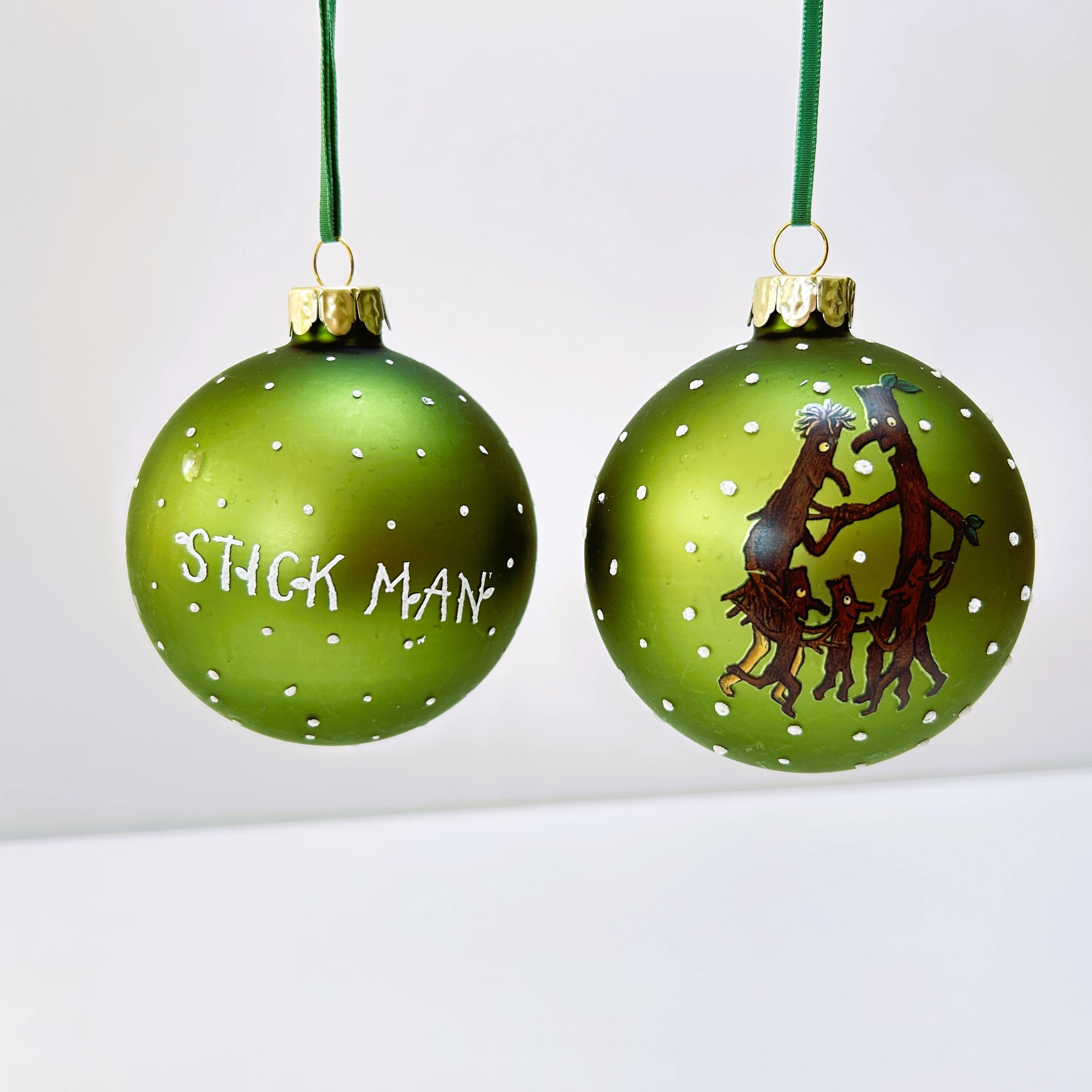 Celebrate the classic Julia Donaldson story with this charming set of two Stick Man glass baubles. These beautifully crafted decorations capture the heart-warming tale with colourful illustrations of Stick Man and his family, set against a festive snowy green background.