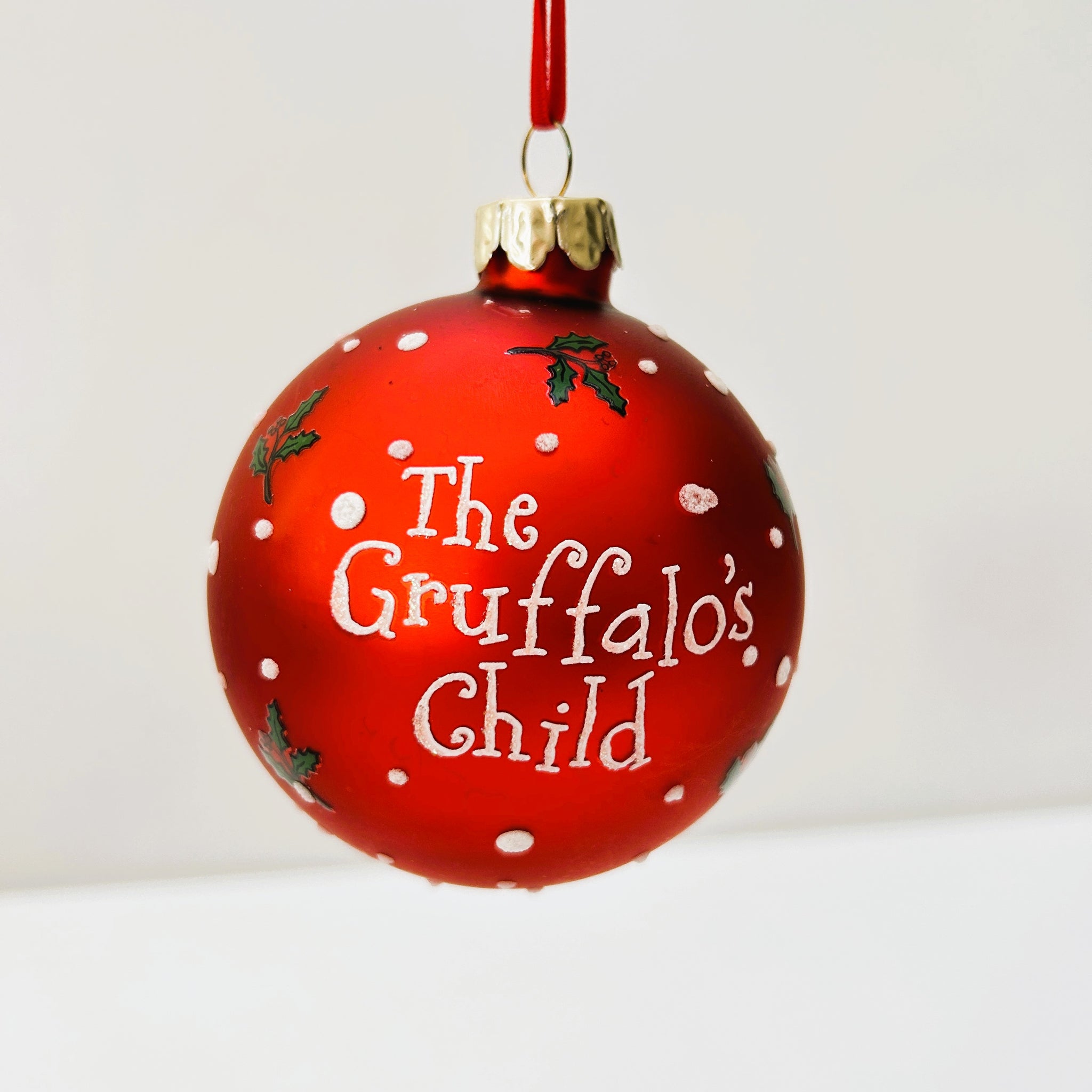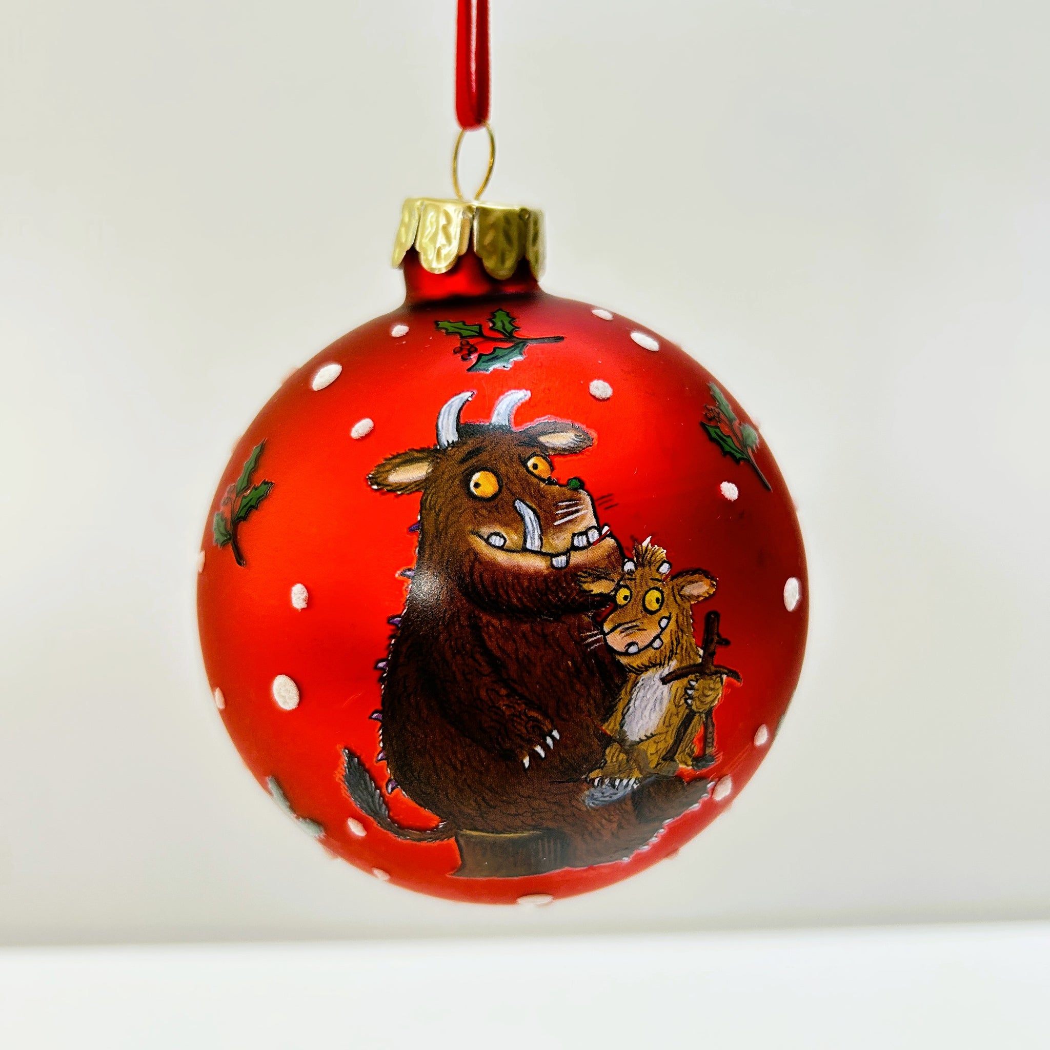 One bauble shows the Gruffalo alongside the clever little Mouse in a green woodland scene, while the other captures a festive moment of the Gruffalo with his child against a snowy red background.