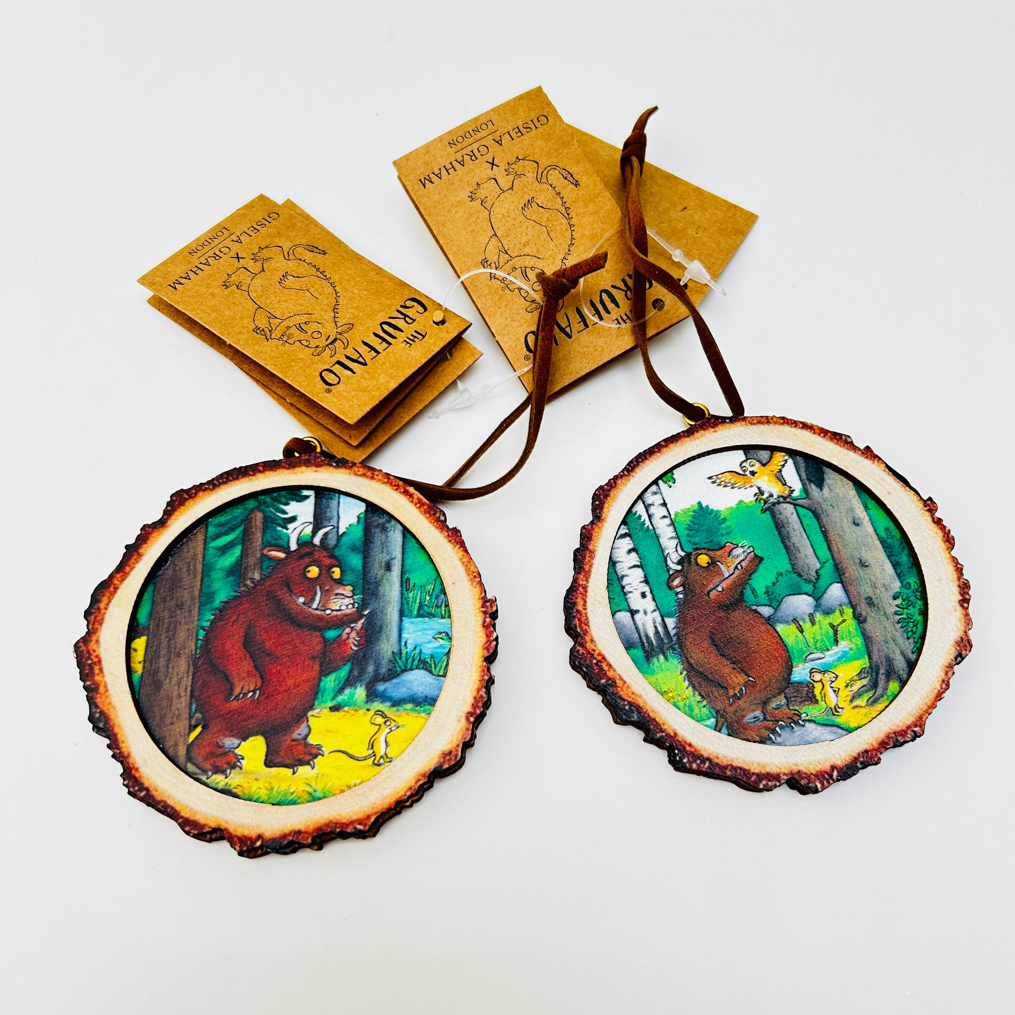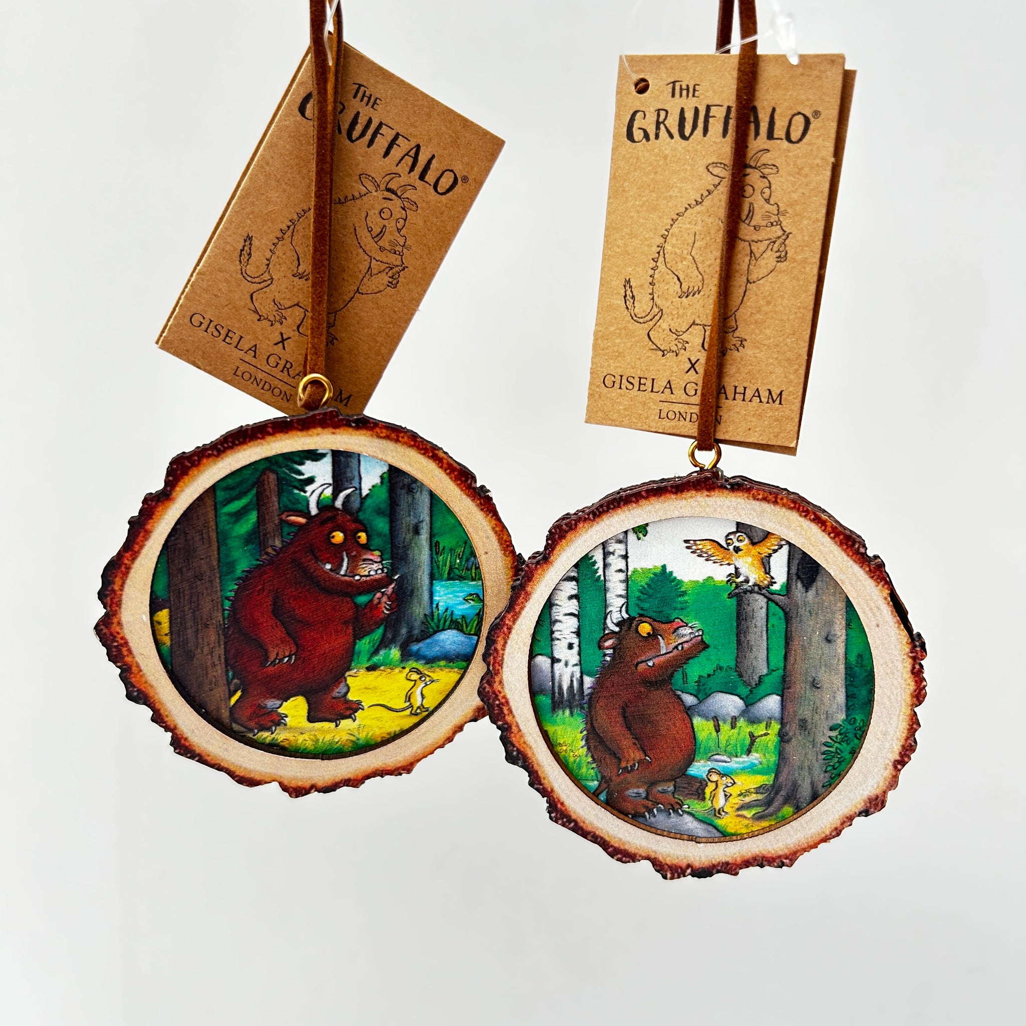 Bring the magic of the deep dark wood to your Christmas tree with this delightful Set of 2 Gruffalo Wood Log Decorations by Gisela Graham. Featuring vibrant scenes from the much-loved story by Julia Donaldson and Axel Scheffler, each ornament is printed on a rustic log-effect disc and finished with a faux leather hanging loop.