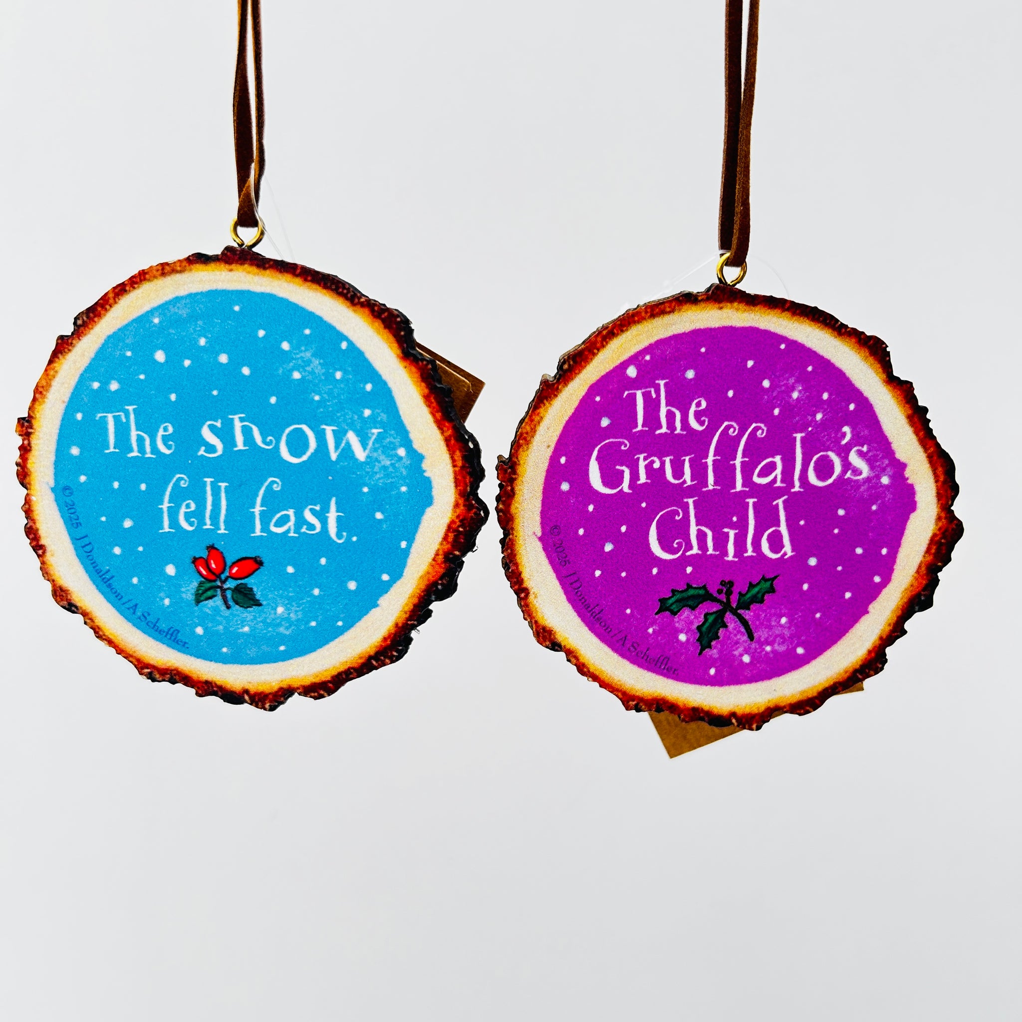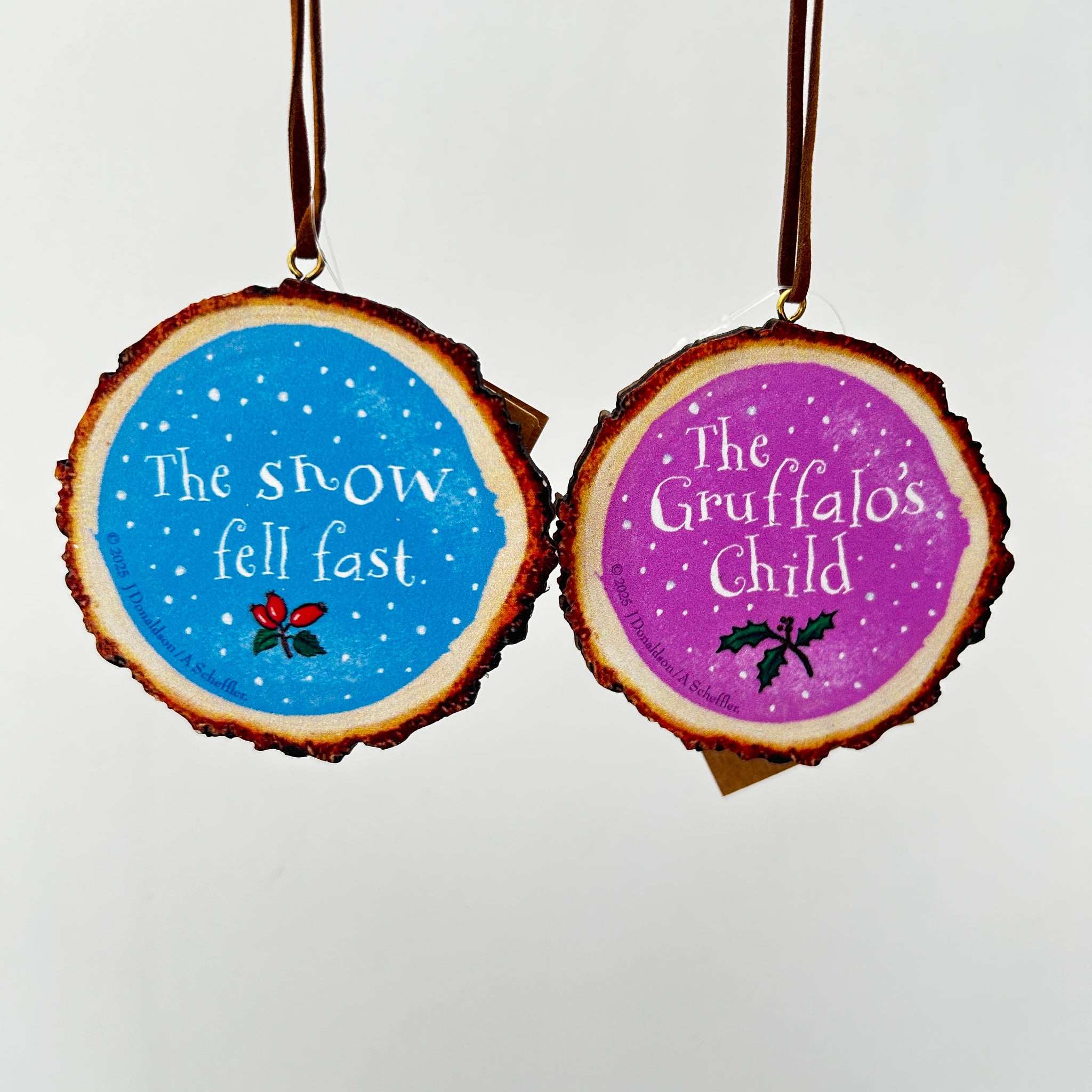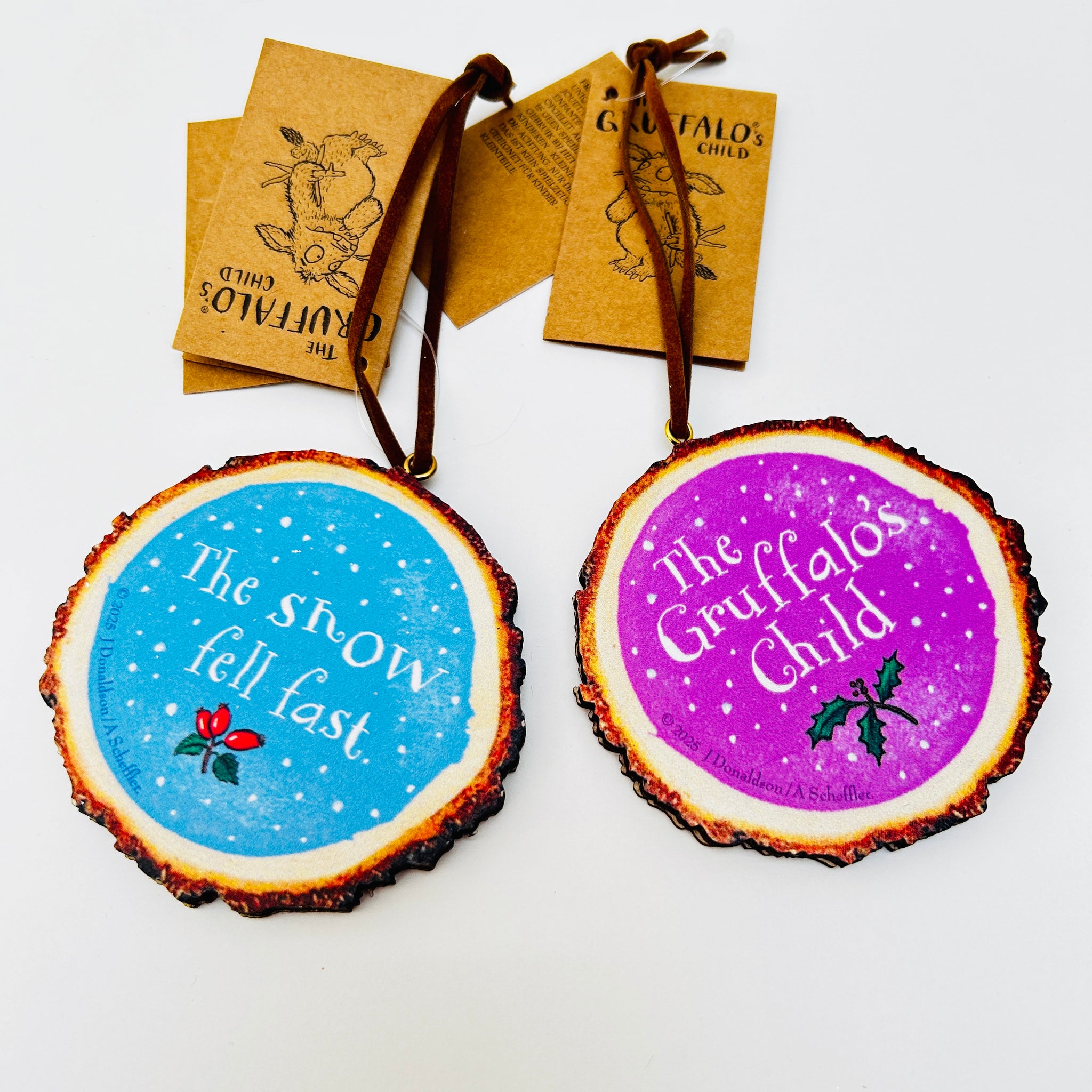 Step into the deep dark wood this festive season with this adorable Set of 2 Gruffalo’s Child Wood Log Christmas Decorations by Gisela Graham. Featuring illustrations from Julia Donaldson and Axel Scheffler’s beloved story, each ornament is printed on a rustic wood-effect log slice and showcases beautifully wintry scenes from the snowy tale. With a soft faux leather hanging loop, these decorations are perfect for children’s trees, book lovers, or fans of the Gruffalo universe.
