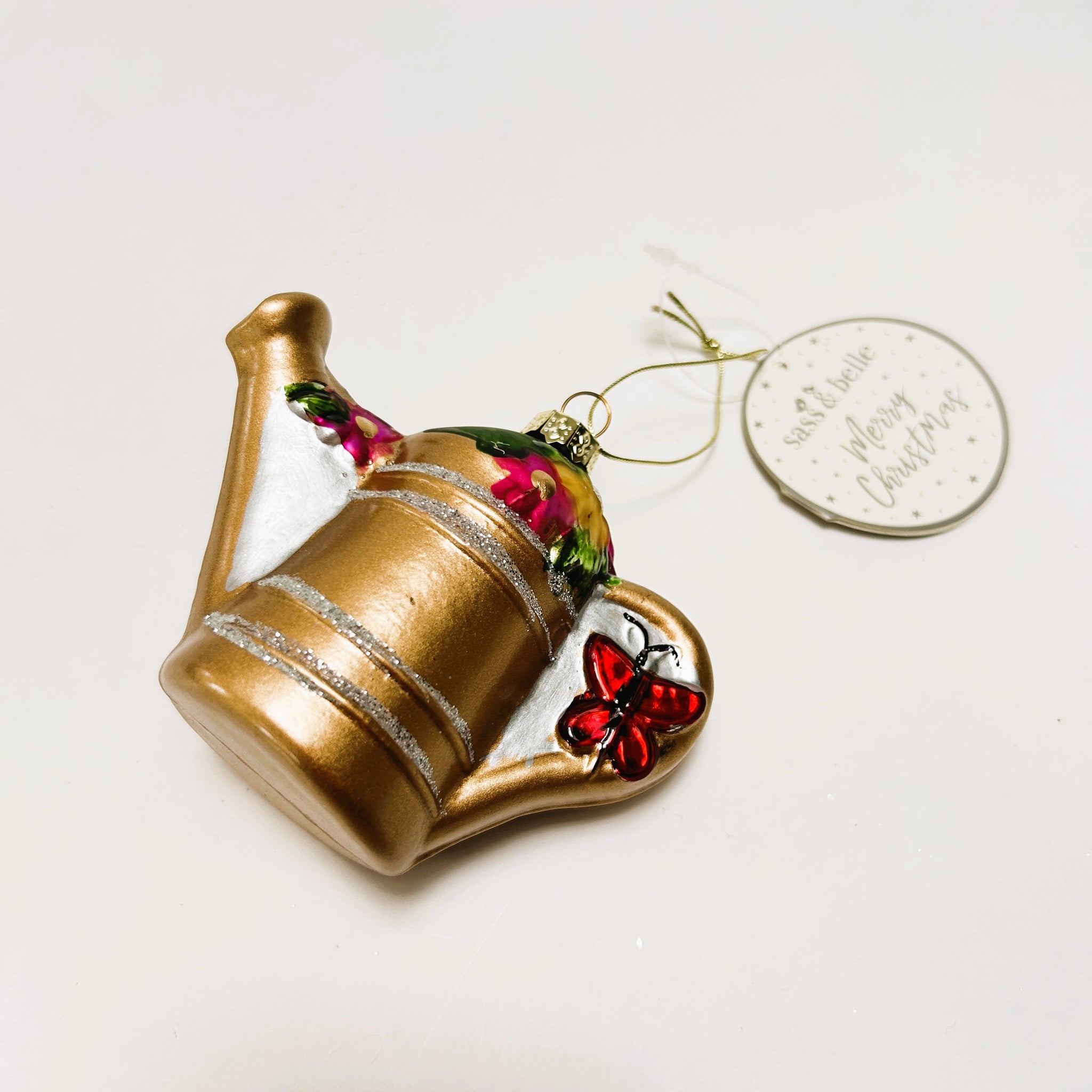 Made with a glossy finish and fitted with a gold hanging loop, this design combines gardening charm with festive style, making it a unique addition to seasonal displays or Christmas tree décor.