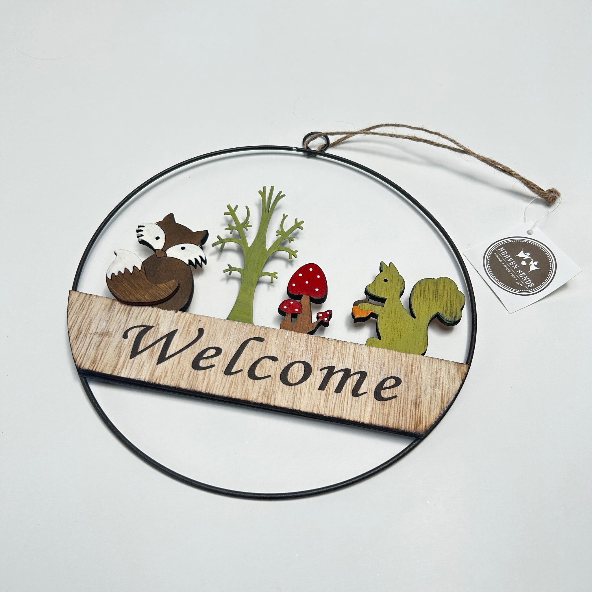 Bring a touch of woodland charm to your home with this circular metal and wood welcome sign. Featuring a playful design with a fox, squirrel, tree, and toadstool, the decoration is finished with a rustic wooden base inscribed with the word 'Welcome.'