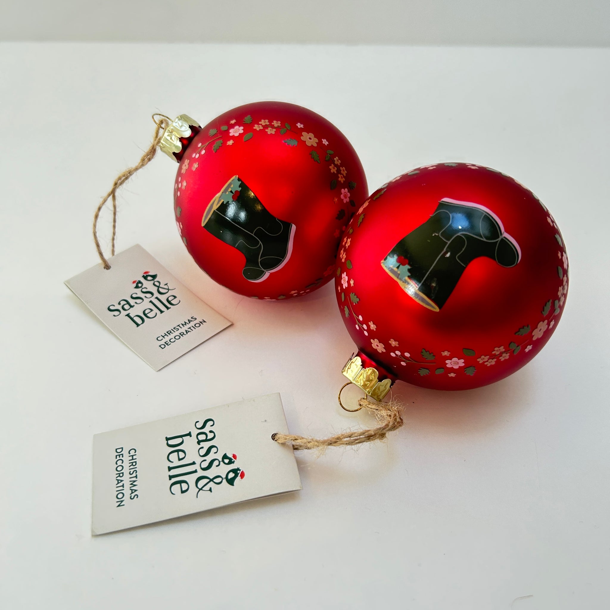 Bring a touch of rustic countryside charm to your festive décor with this delightful set of 2 glass baubles. Each bauble features a vibrant red base decorated with a central motif of traditional green wellington boots, framed by a delicate ring of hand-painted floral detailing. The design celebrates the great outdoors while adding a warm, nostalgic feel to your Christmas tree.