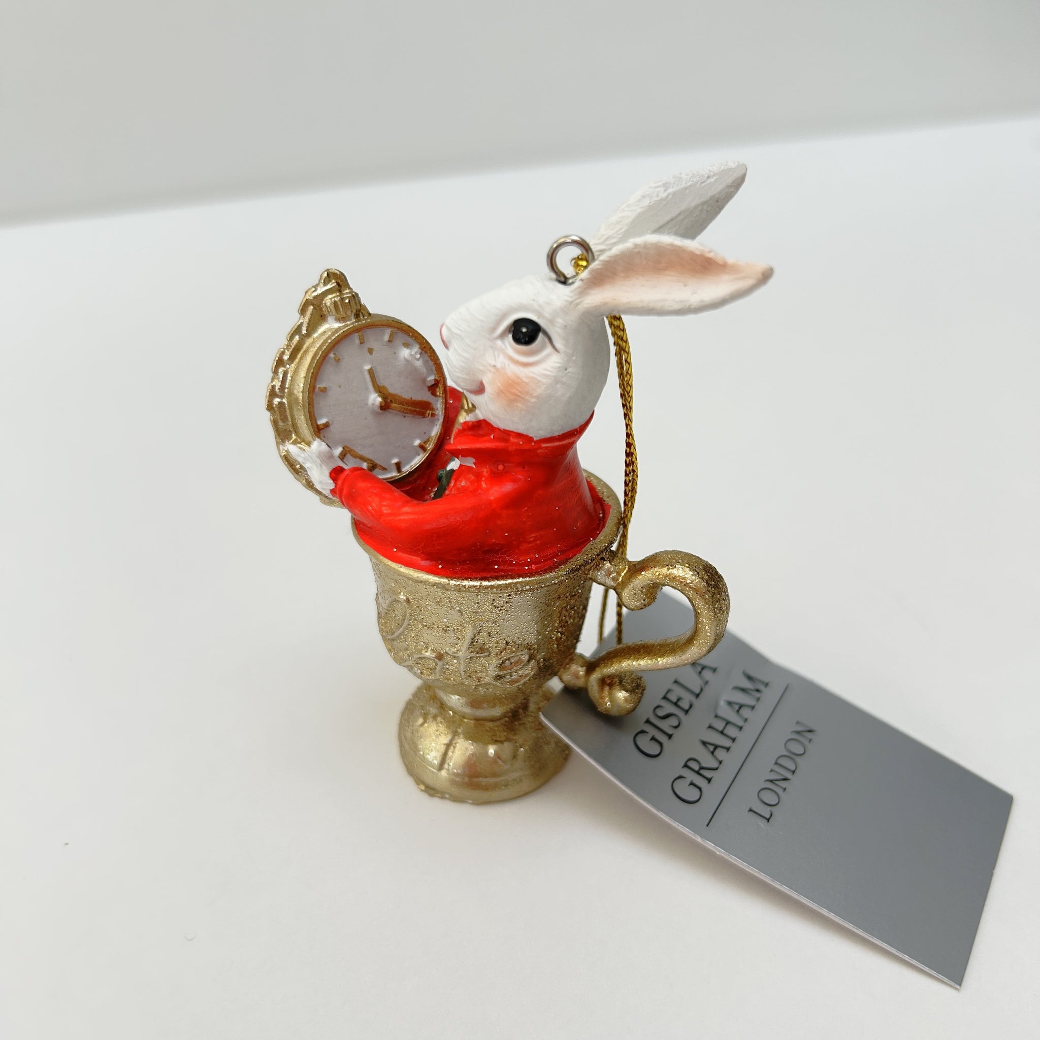 Step into the magic of Alice in Wonderland with this charming White Rabbit in a teacup decoration. Dressed in a smart red coat and holding a golden pocket watch, the iconic White Rabbit sits inside a glittering gold teacup, ready to bring a touch of storybook charm to your festive décor.