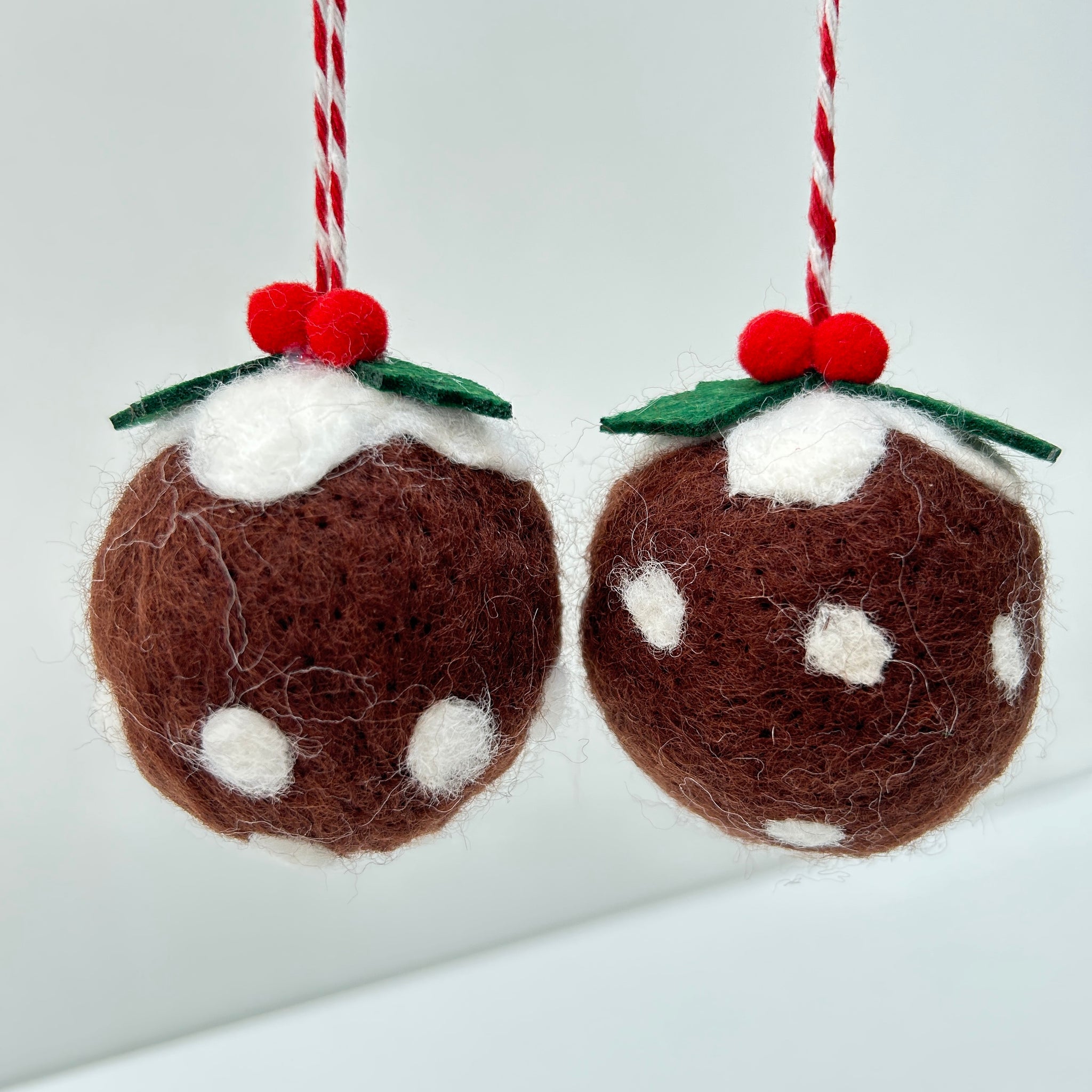Add a touch of festive fun to your tree with this adorable set of two felt Christmas pudding baubles. Handmade from soft felt, each decoration is designed to look like a traditional Christmas pud, complete with white icing, holly leaves and bright red berries on top.