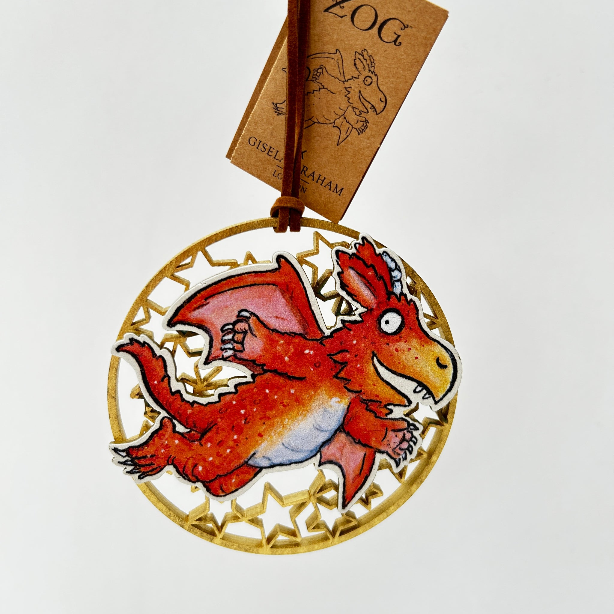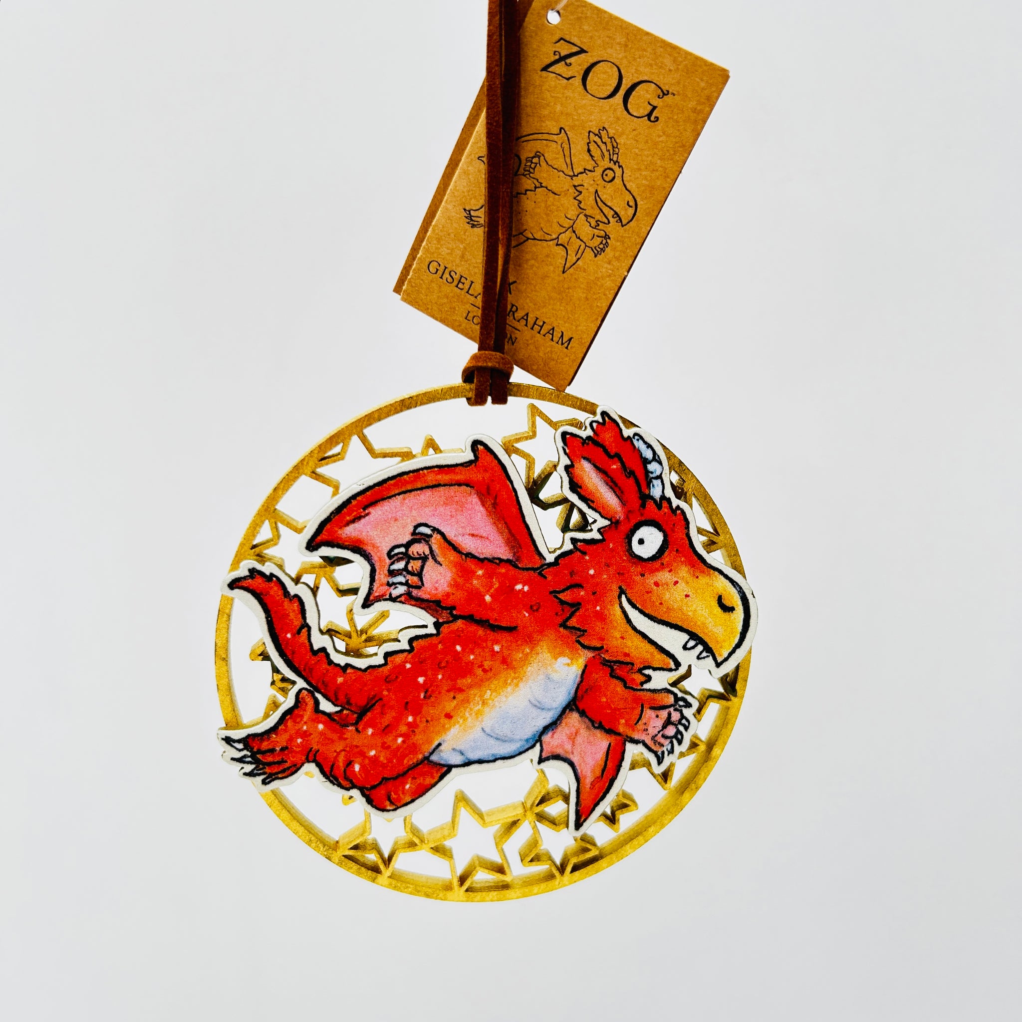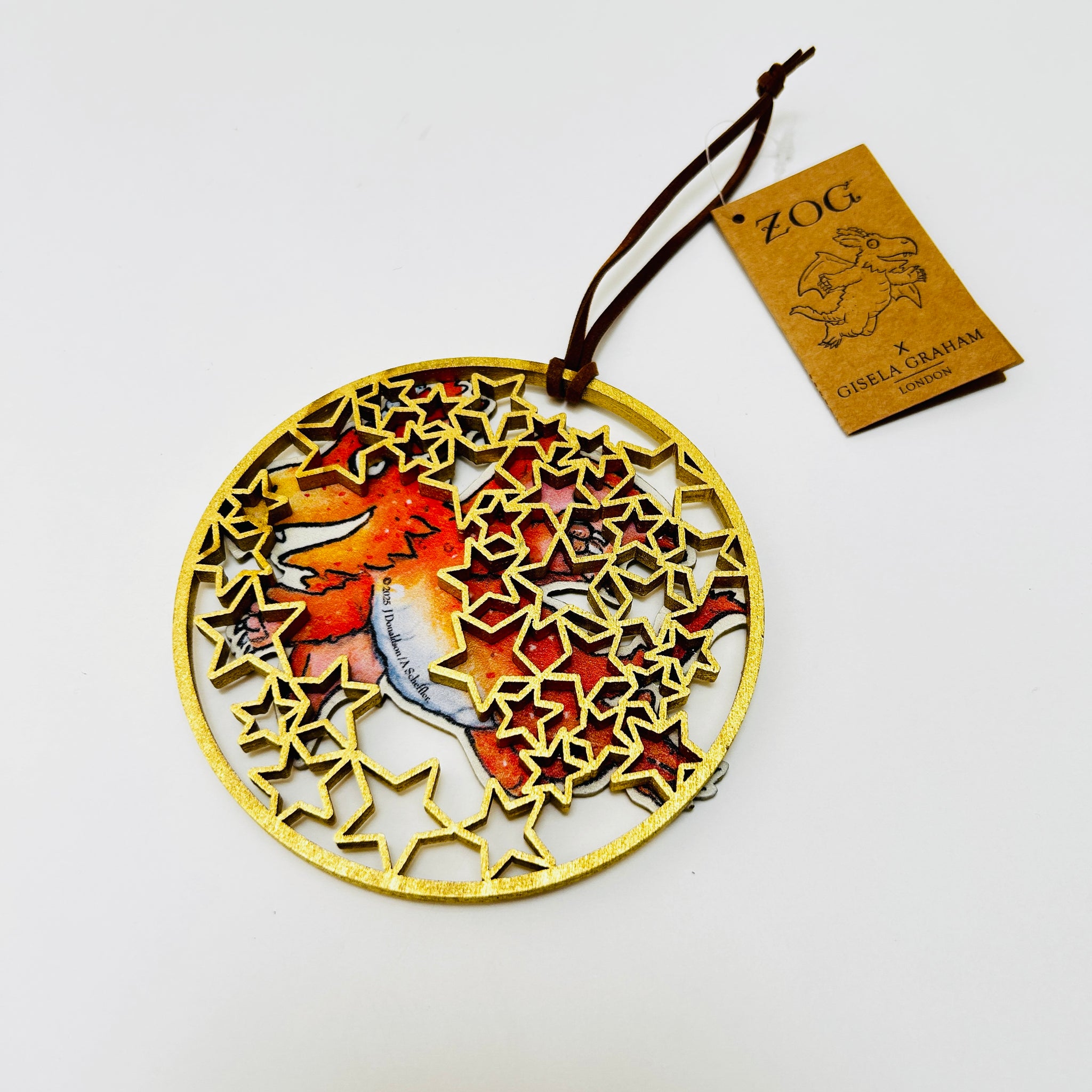 Bring a beloved storybook character to your festive celebrations with this charming Zog Wooden Fretwork Decoration by Gisela Graham. Featuring the friendly orange dragon from Julia Donaldson and Axel Scheffler’s much-loved tale Zog, this lightweight wooden ornament is beautifully detailed with a starry fretwork background and a soft faux leather hanging loop.